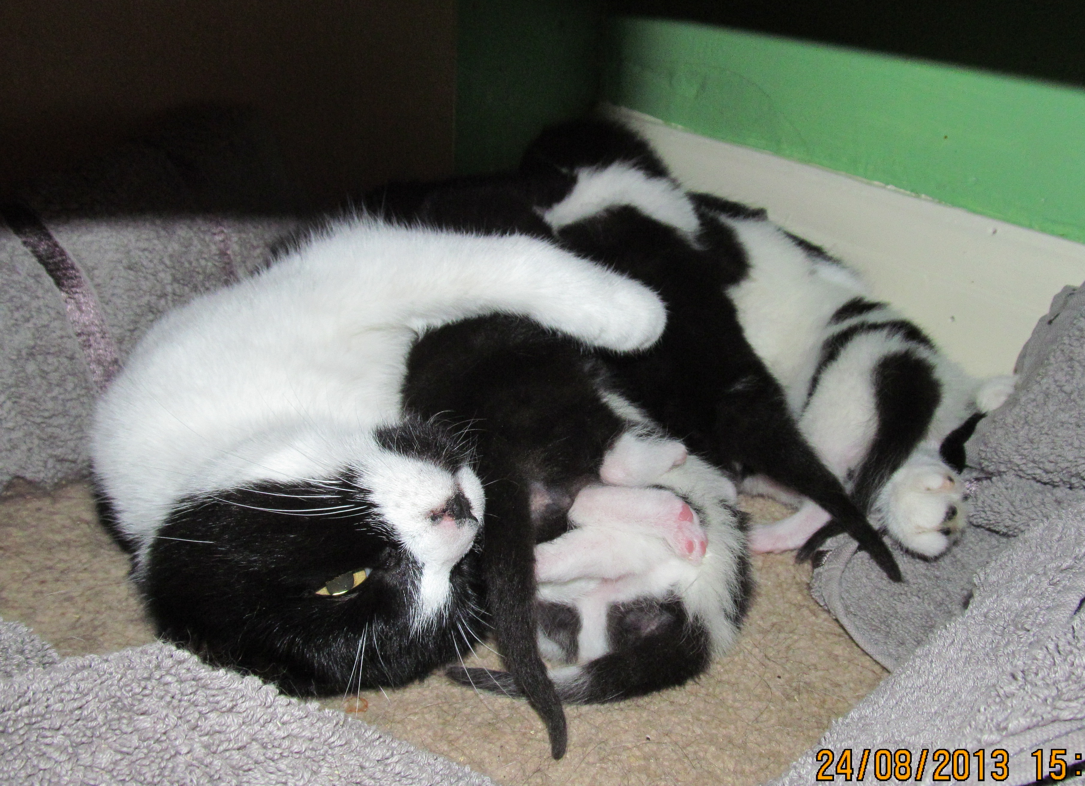 Meg has been neutered now so she’ll never have to go through all that again. And she’s been vaccinated and micro chipped for added protection. She’s a lovely, sweet natured, gentle and loving cat. She was a bit ferocious with other cats whilst her little ones were tiny, but as they’e grown she’s become more ok with them and has accepted Barney as a mother’s help / baby sitter. She’s given young Benson a few clips round the ear … but to be fair … if you met Benson you’d understand 😉