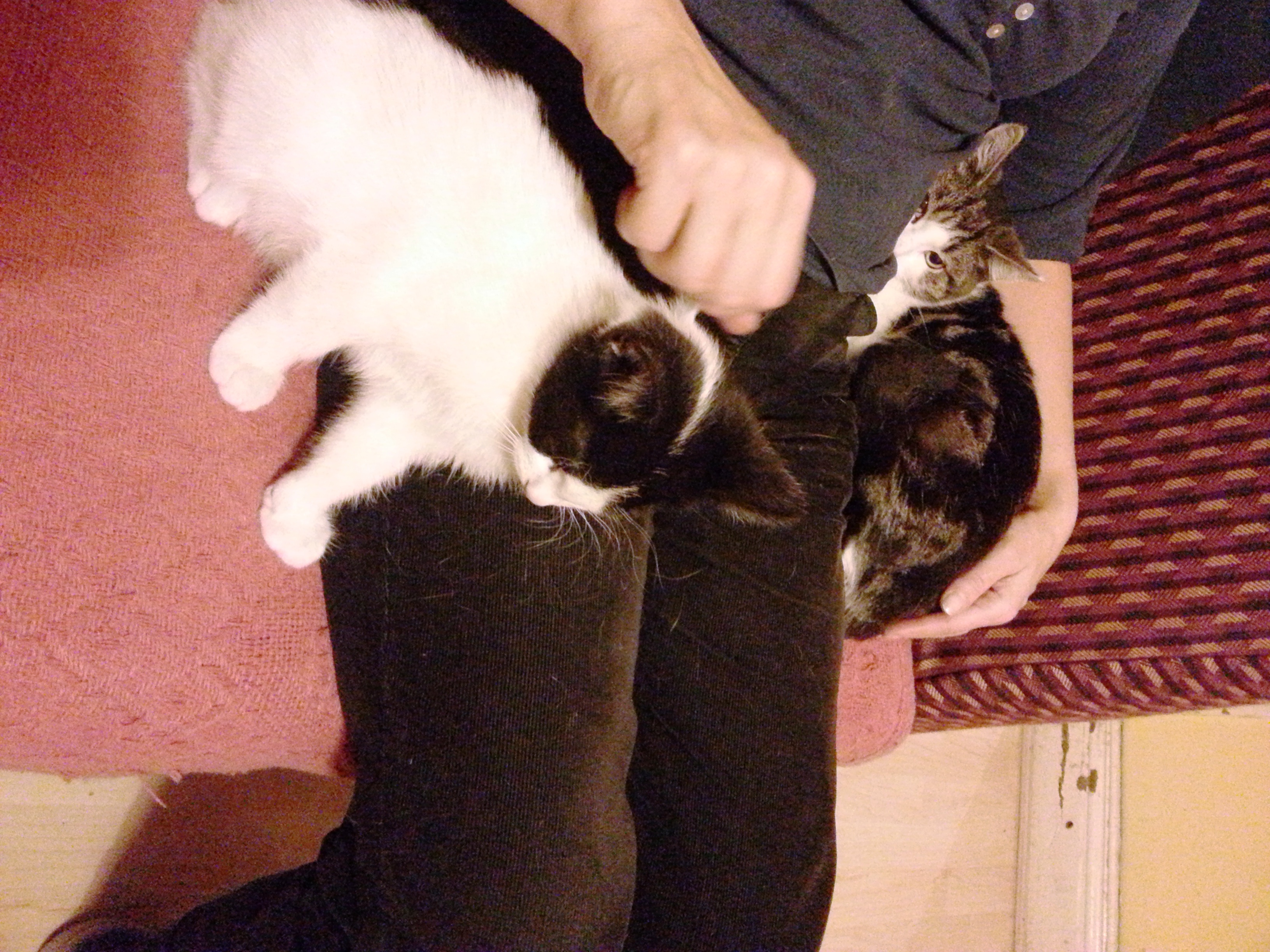 I was a bit anxious about Barney going. Soooo pleased for him that he’d found himself a lovely forever home, but anxious about the disruption to him. He’s made such progress in the last few weeks – from hiding all the time, to coming out to look but running away when you come near, to staying put and watching what you’re doing, and then in the last few days catching himself starting to run up to me for a cuddle … and then I think realising that that wasn’t what he does and backing off again. Such a lovely cat though. When I left him and Minstrel, Minstrel was playing but Barney was under the sofa. Lovely understanding family who were quite prepared to deal with that and let him come out when he was ready. I thought he’d be there for a couple of days at least. Tears in my eyes when I got a photo of them later that evening. Barney, bless him, still looking anxious, but up on the sofa with his new human.