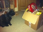 It’s just possible that you’ll remember that Sooty had a parcel from a secret admirer back in May when he wasn’t very well. It was stuffed with all manner of goodies which he nommed his way through over the summer. I was surprised and delighted when aunty Moggie messaged me to say that he’d had another delivery from the same wonderful person.