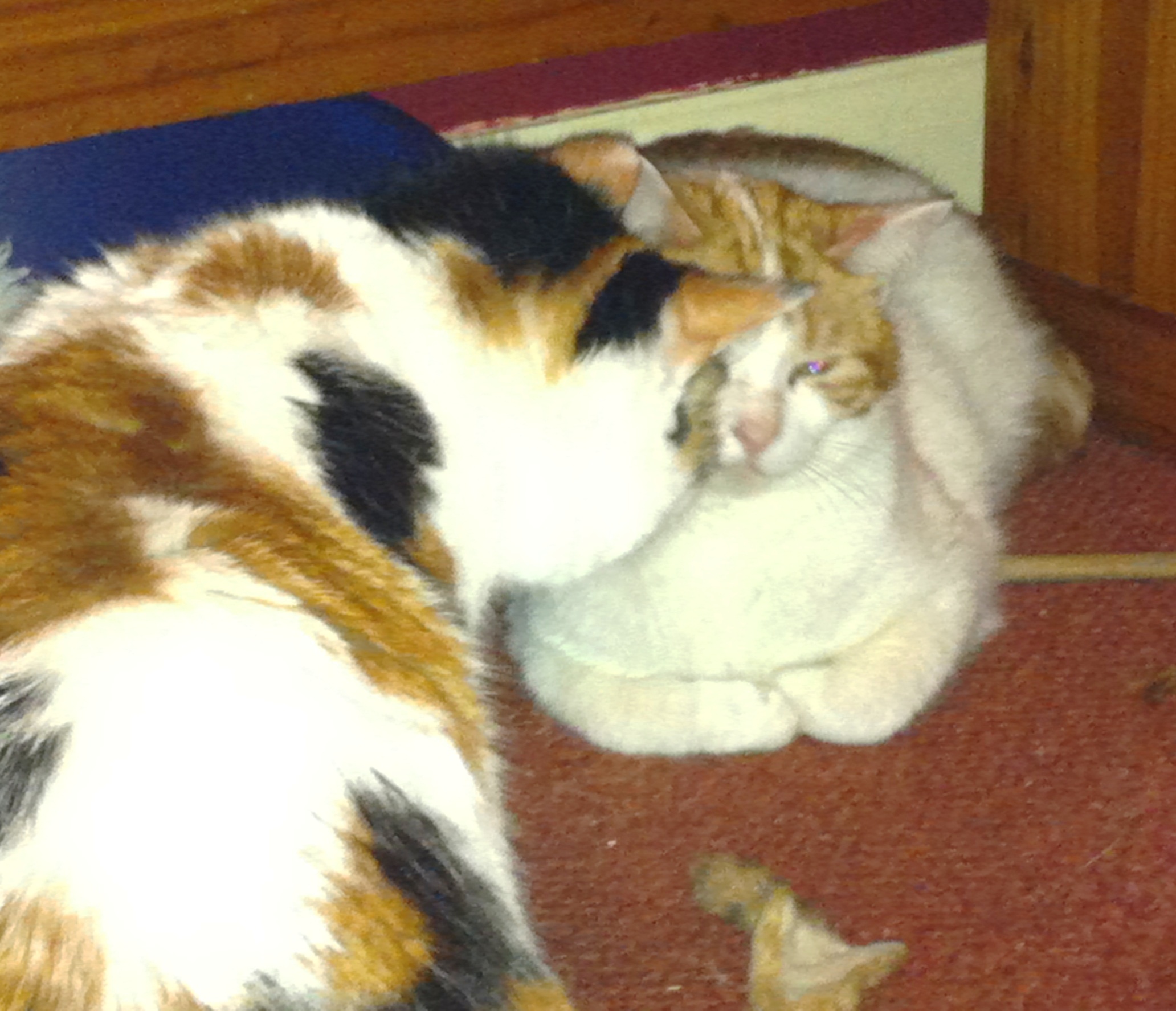 Time suddenly seems to have flown and Jak and Jen have been here 6 weeks.   As with most difficult things, all 3 of us seem to have found a level and muddled our way through it.   We’re all a bit more relaxed around each other than we were.  Jenny has settled into being a lovely snuggle puss – she purrs loads and rubs round me and rolls over on her back, loving a fuss.   As with all cats, you respond to that invitation to tickle her lovely fluffy tummy at your own risk 😉