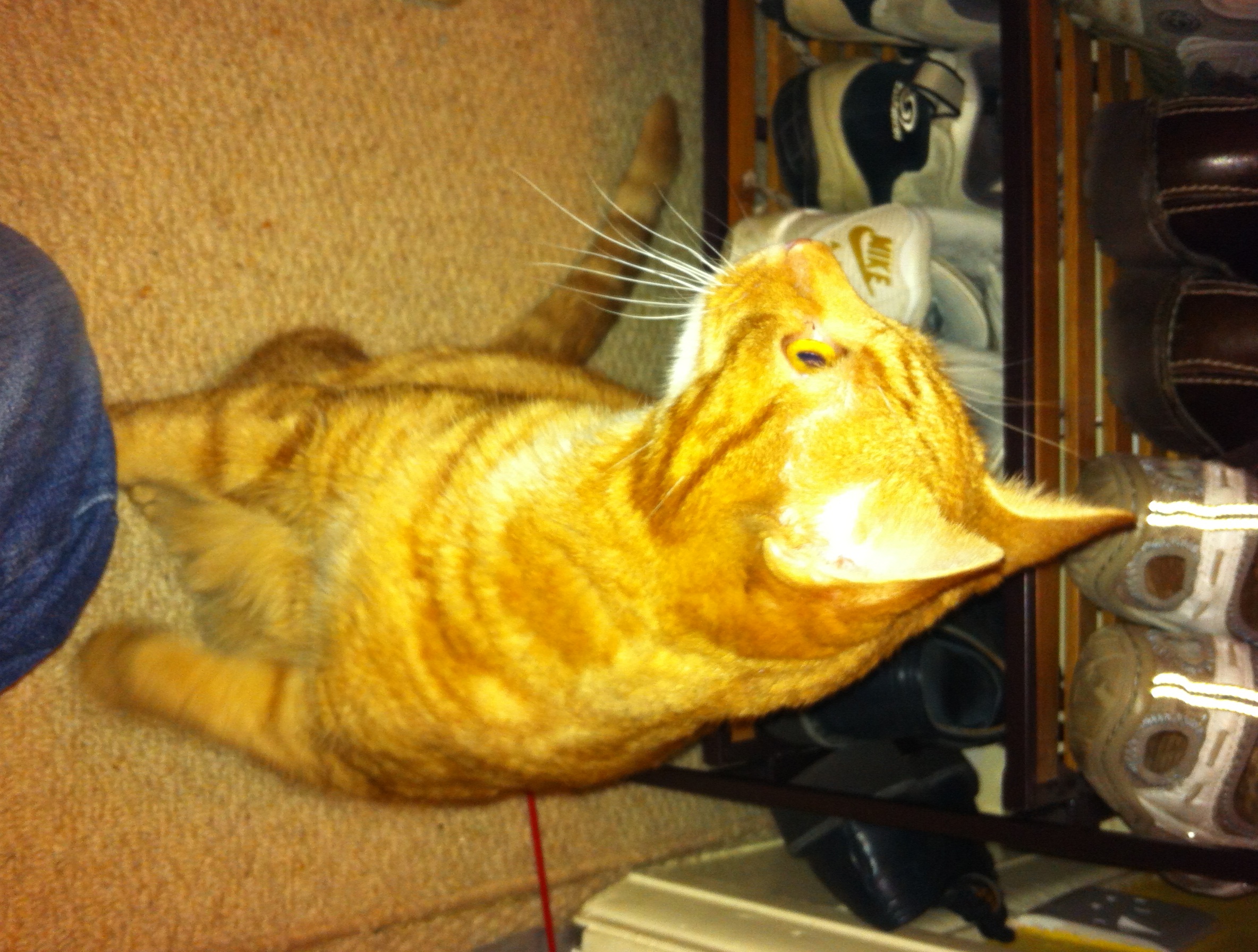This Xmas’ heart throb arrived yesterday. Because he came at Christmas Sooty wanted to call him Cheeses, Flipper wanted him to be Rudolph, I’d vaguely entertained the idea of Santa or Claus …. but when it came to it, we called him Leo, the name the lovely lady who brought him into rescue would have given him had she not been afraid to name him in case she couldn’t part with him. She’s a fantastic person who helps lots of strays in Birmingham, and spotted Leo living amongst them when he was only quite a small kitten. She took him in and cared for him but hasn’t had any luck re homing him.