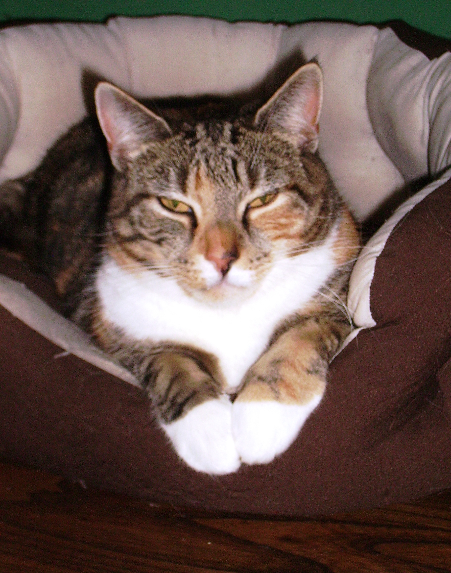 Other than the day I arranged for someone to come to the house to microchip her (she needs her own door key to the microchip cat flap), and a couple of times a friend came to help me frontline her, I’ve not tried really to touch her. There’s been the odd occasion where I’ve just been randomly stroking people, or mistaken her for Flipper and tried to run my hand down her back, but nothing serious. Slowly she’s got more comfortable, and started to sit in her basket right by my lap top, watching … or just snooozing …