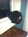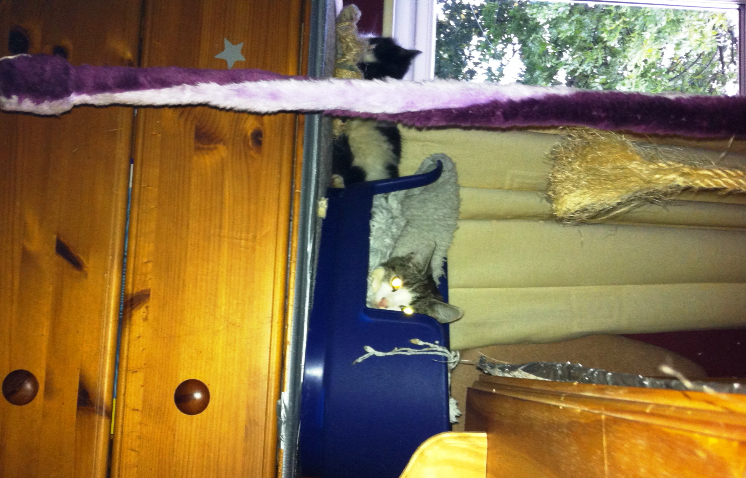 We’re all happy now. Echo is under the bed still but purring lots and enjoying a fuss. Edna has made her way down from the heights.