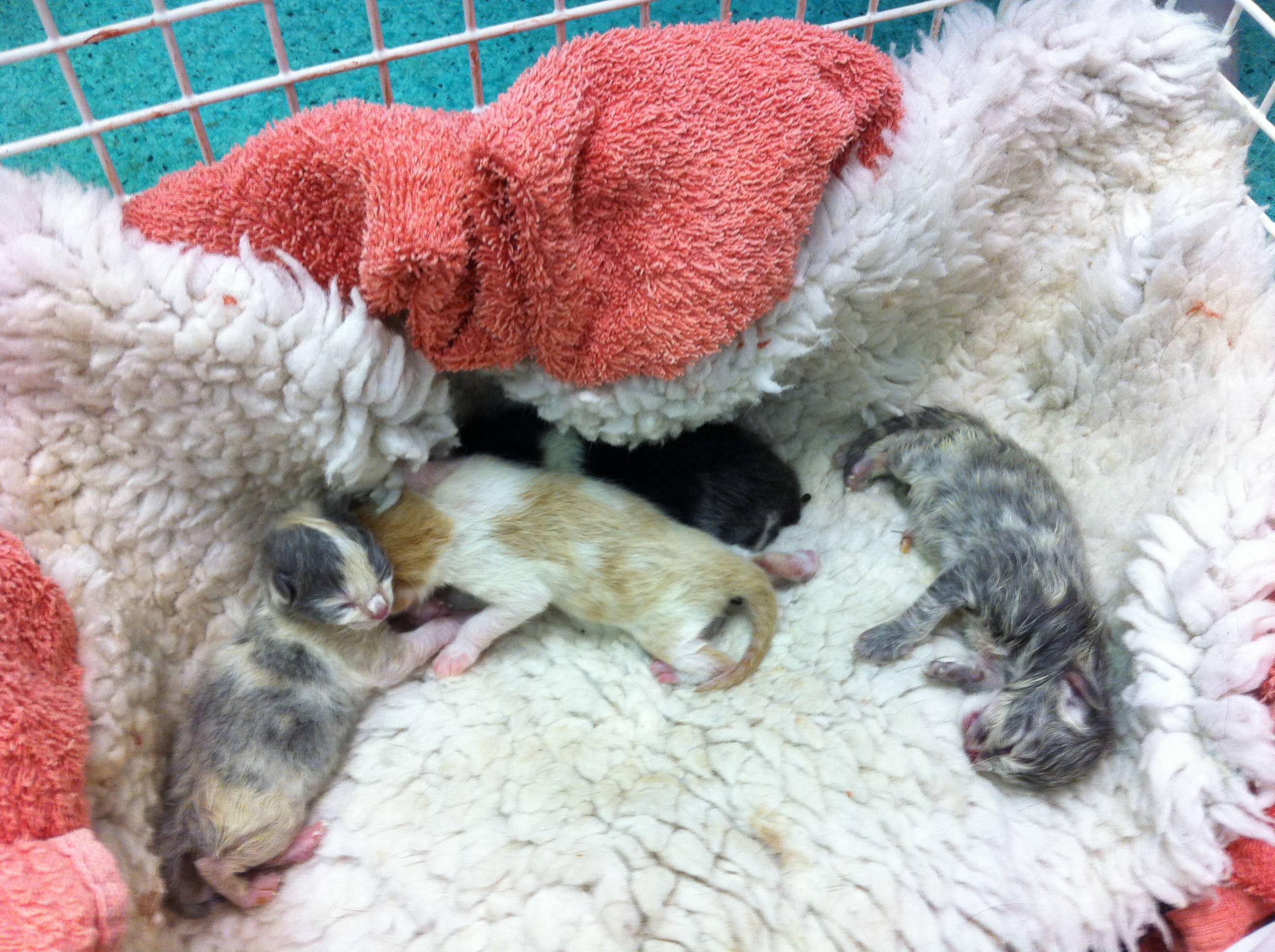 There was a long wait whilst Chi had an emergency section. Another kit was stillborn and then two more born alive … just. Hours later, Chi was struggling to come round from her op. She and her kits went home for the night with the vet nurse so that they could be monitored and cared for. Although she seemed to be coming round, Chi collapsed in the early hours of Friday morning, and died, leaving 4 newborn kittens without a mummy.