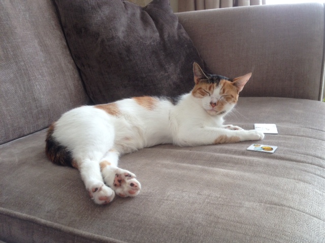 And then Nala, the mummy, went off to her new home too. Of all of them, she was the most nervous. However she’s had the hardest life. Bless her, she’s protected her kits from the difficult bits. She was a stray but found herself a safe temporary space before the little ones were born. While they were still small and oblivious to the dangers of life, she hissed and growled and protected them when she first arrived here in rescue. They’ve never had to worry because mum has kept them safe. She crawled under the sofa when she arrived, almost risked coming out but then saw her reflection in the litter bin and dived for cover again. I had to lie on the floor and reach under the sofa to say goodbye, but was delighted to have a message the following day saying that she’d already learned to play a mean game of “snap”