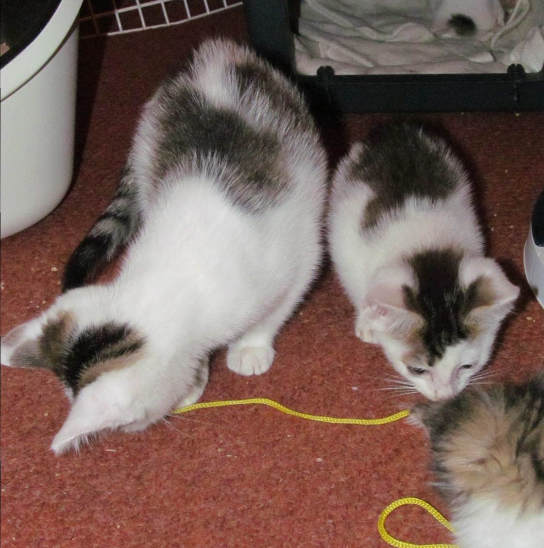 He ate a little, not a huge amount. The usual pattern is that when taken back to their room he scuttles off to hide and sleep again. However this evening it was different. He got into a basket, but then when the other kittens were playing, started to get interested and eventually joined in. He didn’t take part in the mad game of tearing up and downstairs that the others were absorbed in, but look at this …. seen playing for the first time