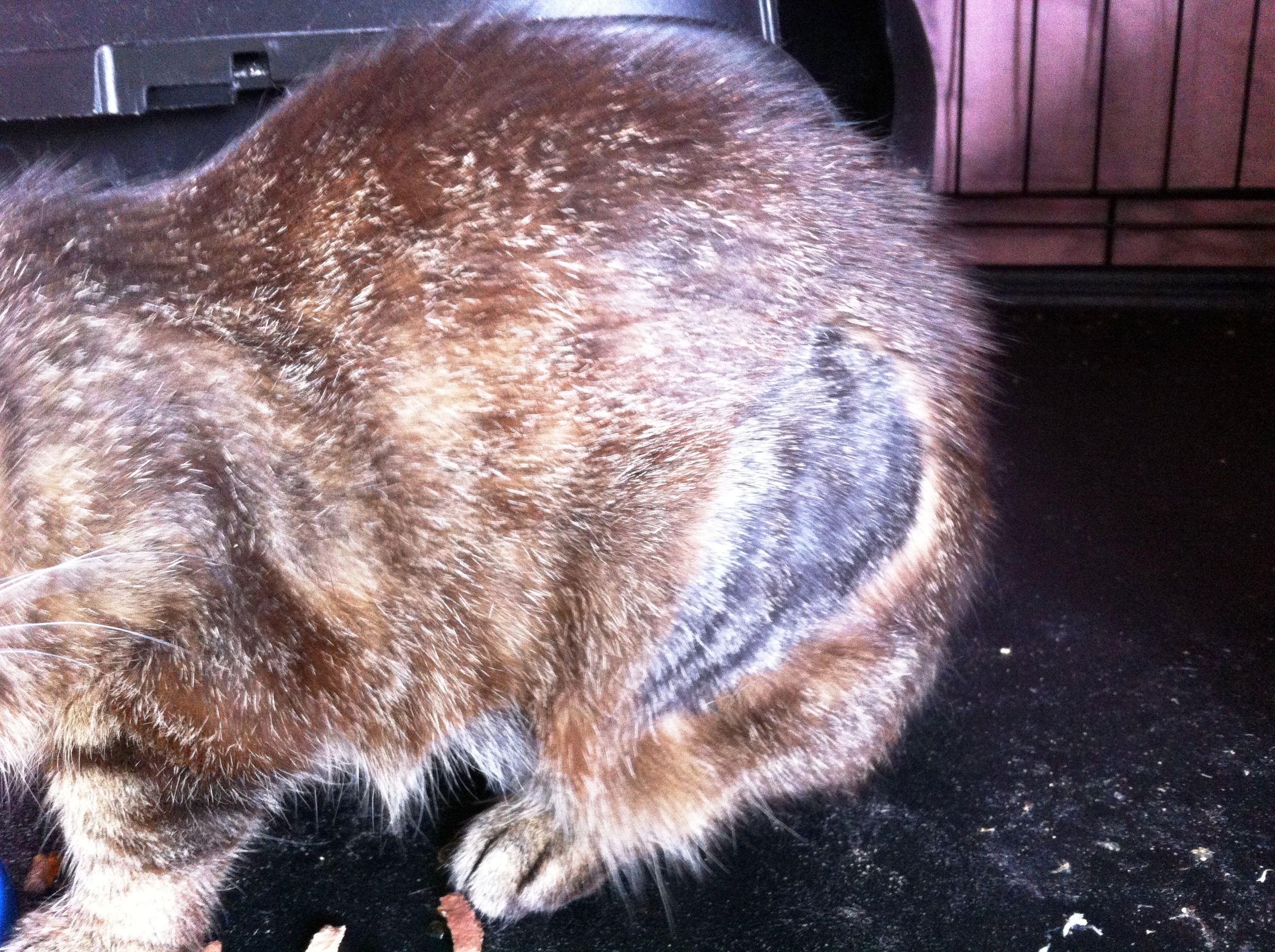 5. I’m fascinated by her fur. Various vet interventions meant that she had lots of areas shaved: tummy (for ultra sound when she was poorly and pregnant), side (when she was spayed), neck (for blood tests). On top of that. she’s shed hair like its going out of fashion – perhaps no longer needing so much now she’s not living rough. Here’s the curious thing though – she came here as a very brown tabby and as her coat has re grown she’s quite grey.