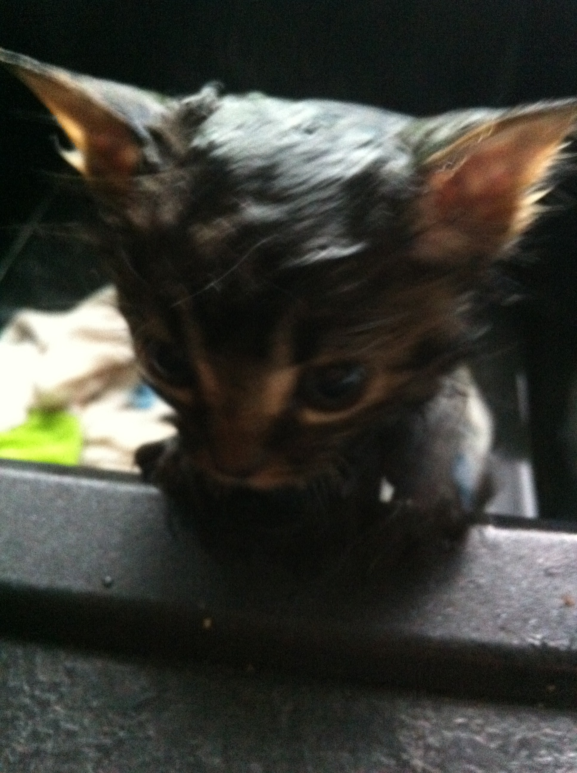 Sadly little Indie (and his brother to a slightly lesser extent) were so horribly stinky that we had to brave the bath. I got it all prepared and braced myself for low flying kittens. Put Indie in the kitchen sink in warm water … fulling expecting all hell to break loose …… but he just stood there. I wet his fur, lathered him in shampoo …. and he stood there. I scrubbed a bit and then rinsed him off …… and he stood there. I picked him out, toweled him .. and he stood there. I started to blow dry him … his coat puffed out like a dandelion head … but he just stood there.