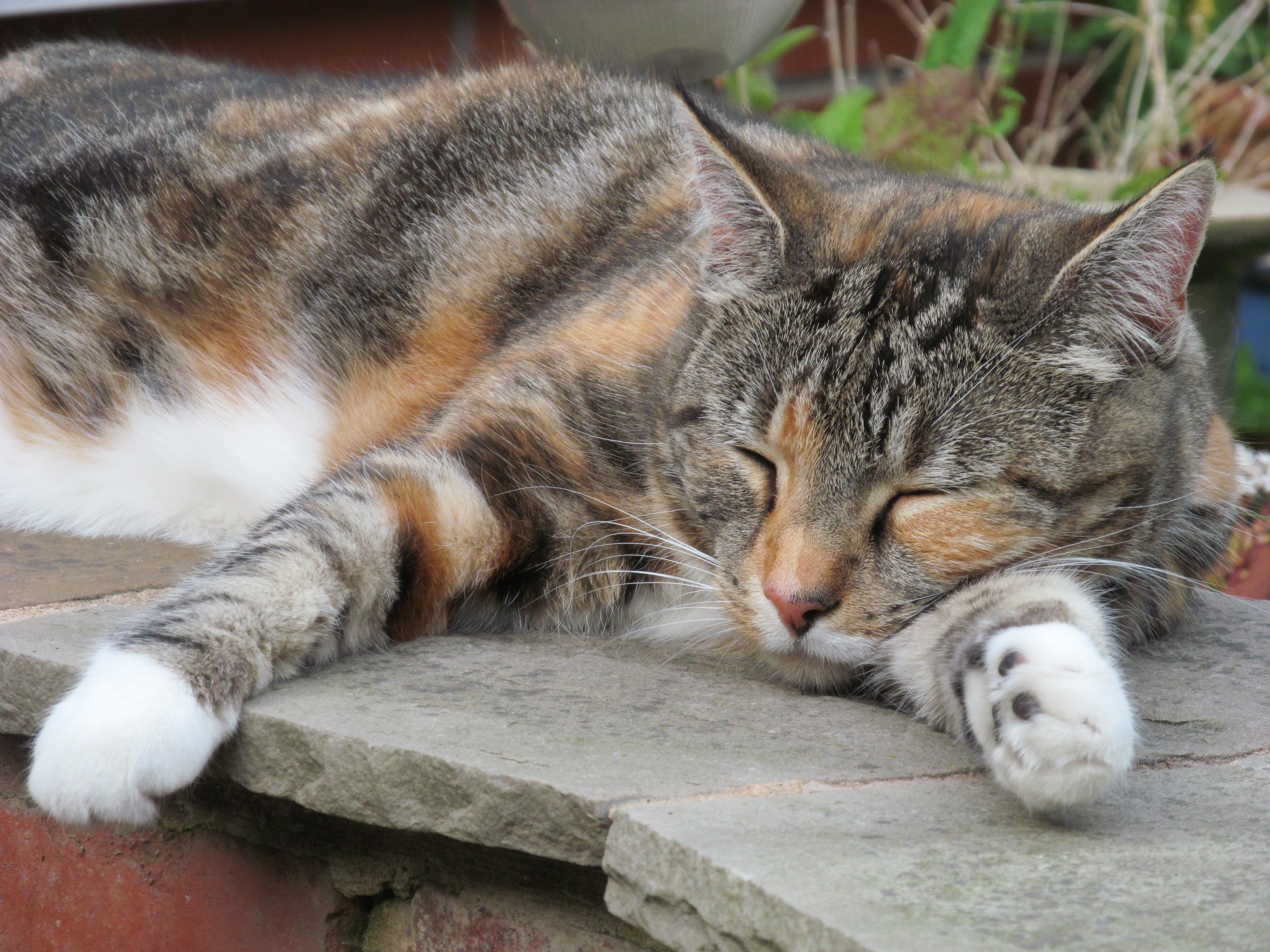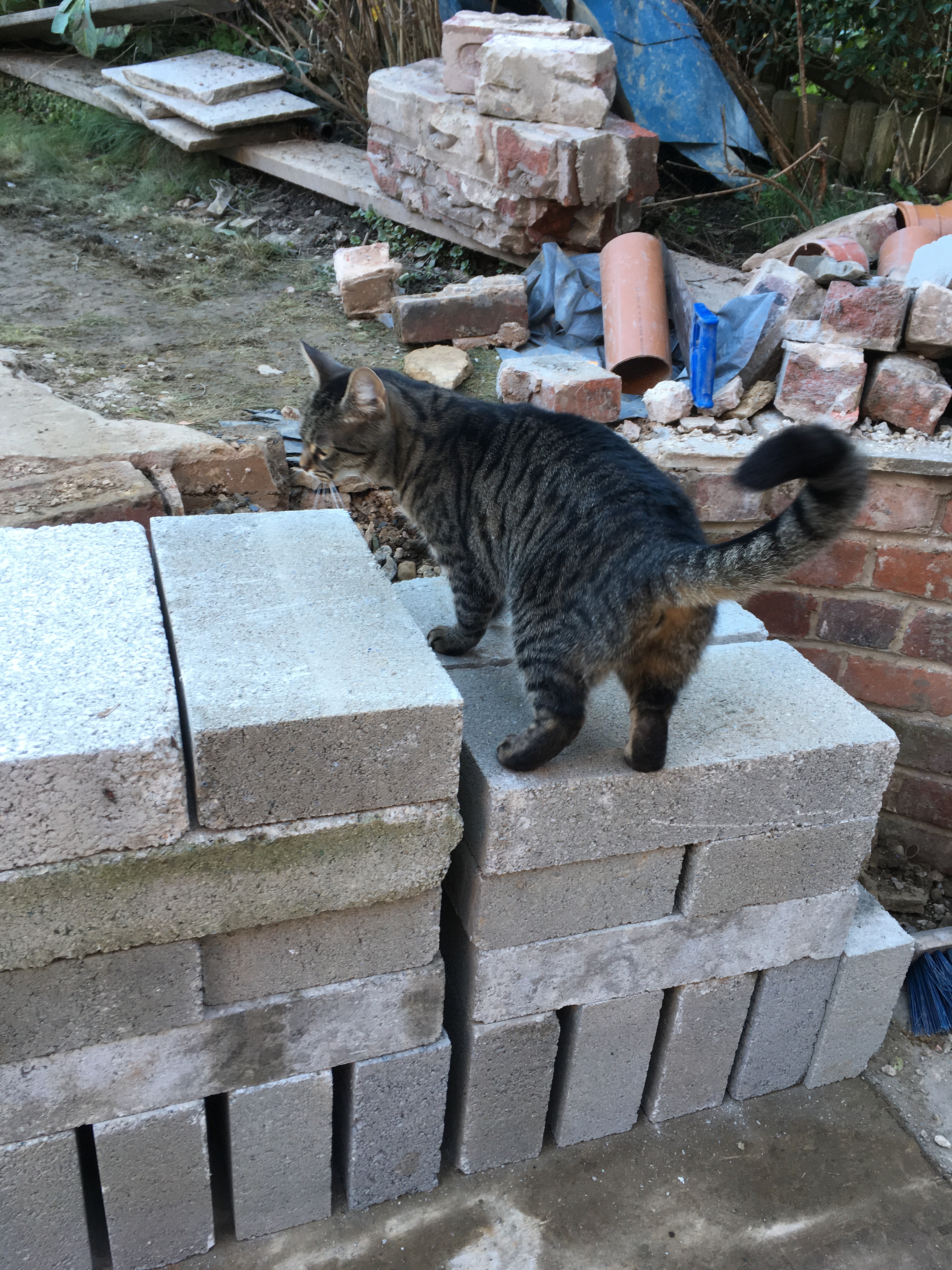 Day 1 of building work, the day after we brought Tippy’s ashes home, we were kind of ready for it and it was exciting. By Day 2 I wanted to call it off. I’d anticipated that the cats wouldn’t want to be in the kitchen right next to the noise and disruption, but hadn’t anticipated that the back door would be open much of the time, that it would be impossible to sneak between kitchen and lounge without cats getting through the door and hence outside under the diggers etc.. So then realised they would have to spend the time whilst the builders were here upstairs! It’s not easy posting them all through the door at the bottom of the stairs without all the previously posted ones avalanching back down! Even less easy doing it first thing in a morning with only one mug of caffeine on board. The biggest challenge though is Amber, our semi feral cat.
