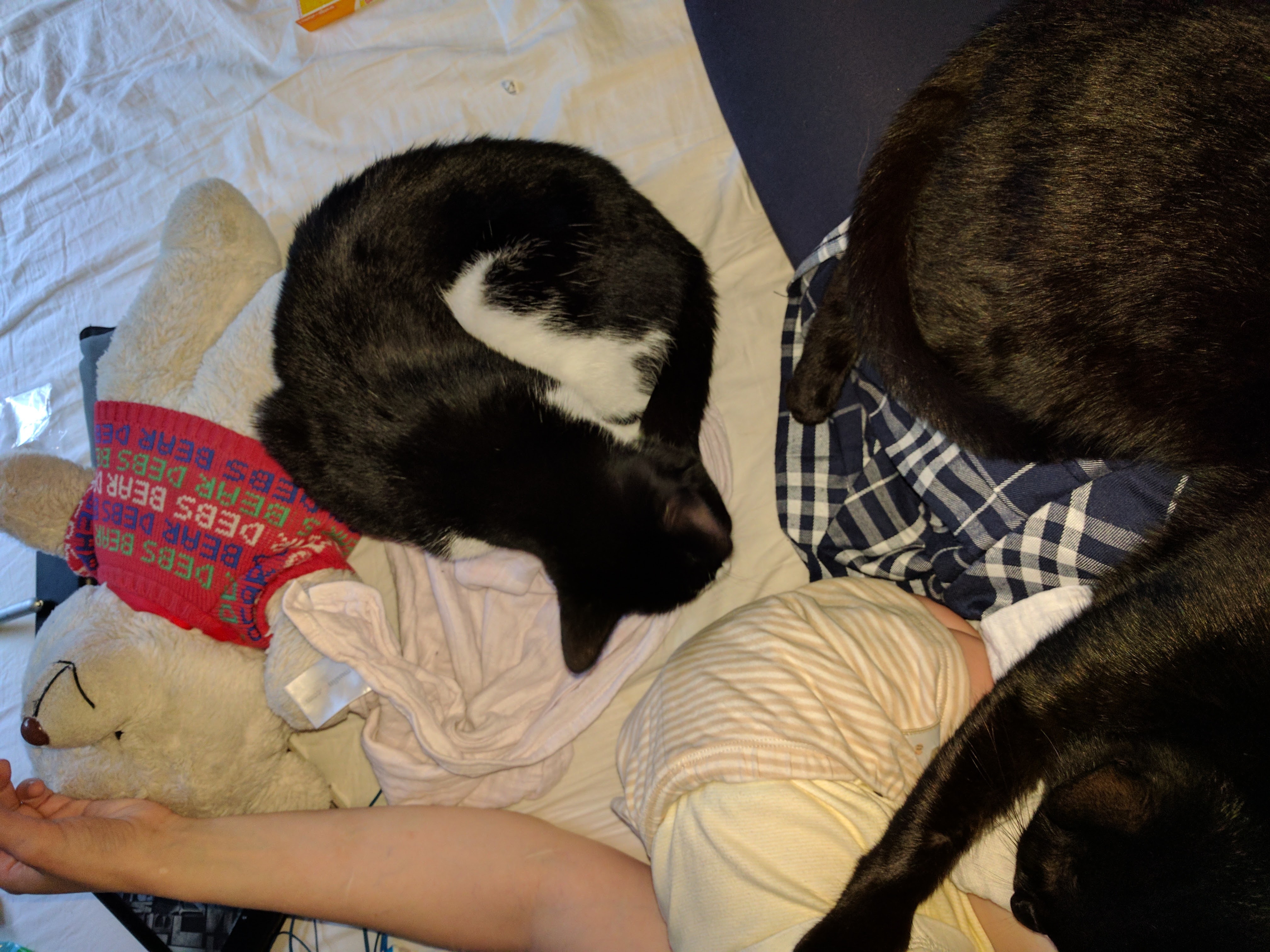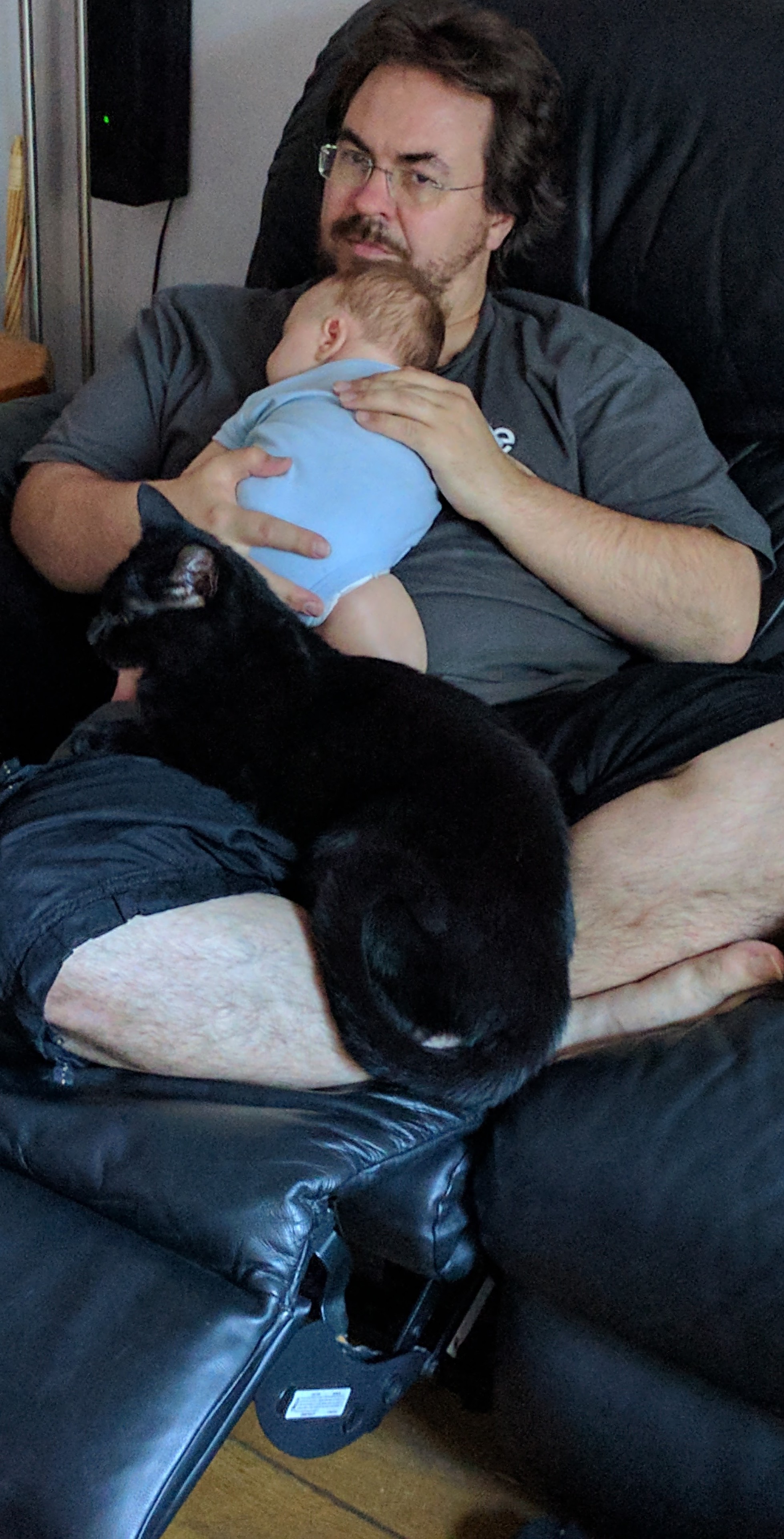 Minnie is also very attentive and if the baby cries and we are not both there already she will herd us to him. They both spent a lot of time snuggled up around us as I was recovering.