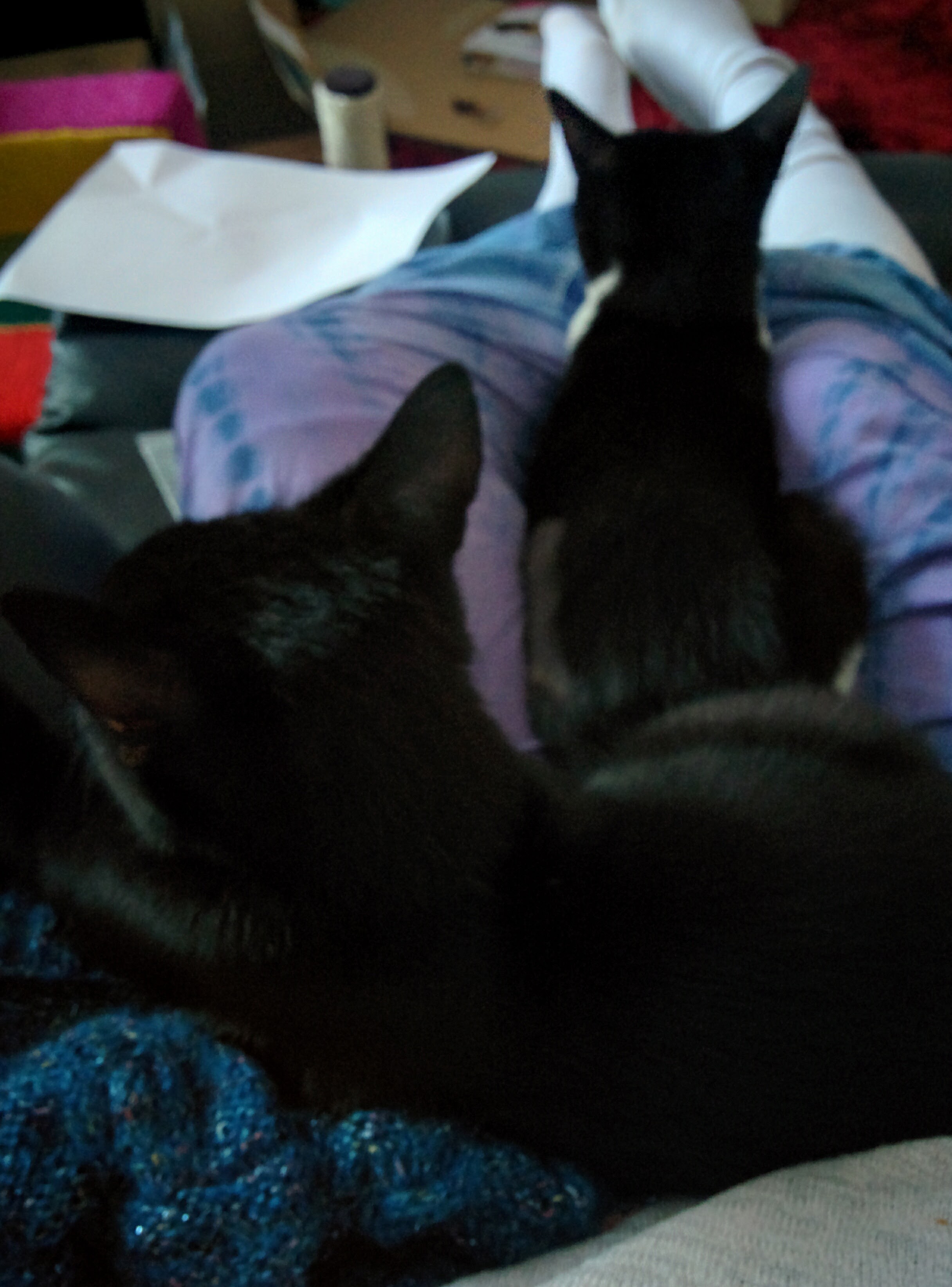 To my delight after a few days they also took to snuggling on my lap. Simon prefferred to be up at chest level as he had while watching candy crush as a tiny kitten while Minnie liked to squeeze between my legs especially if I was wearing a long skirt for her to sit on. They still like to snuggle like this though they are much bigger now.