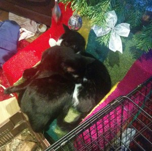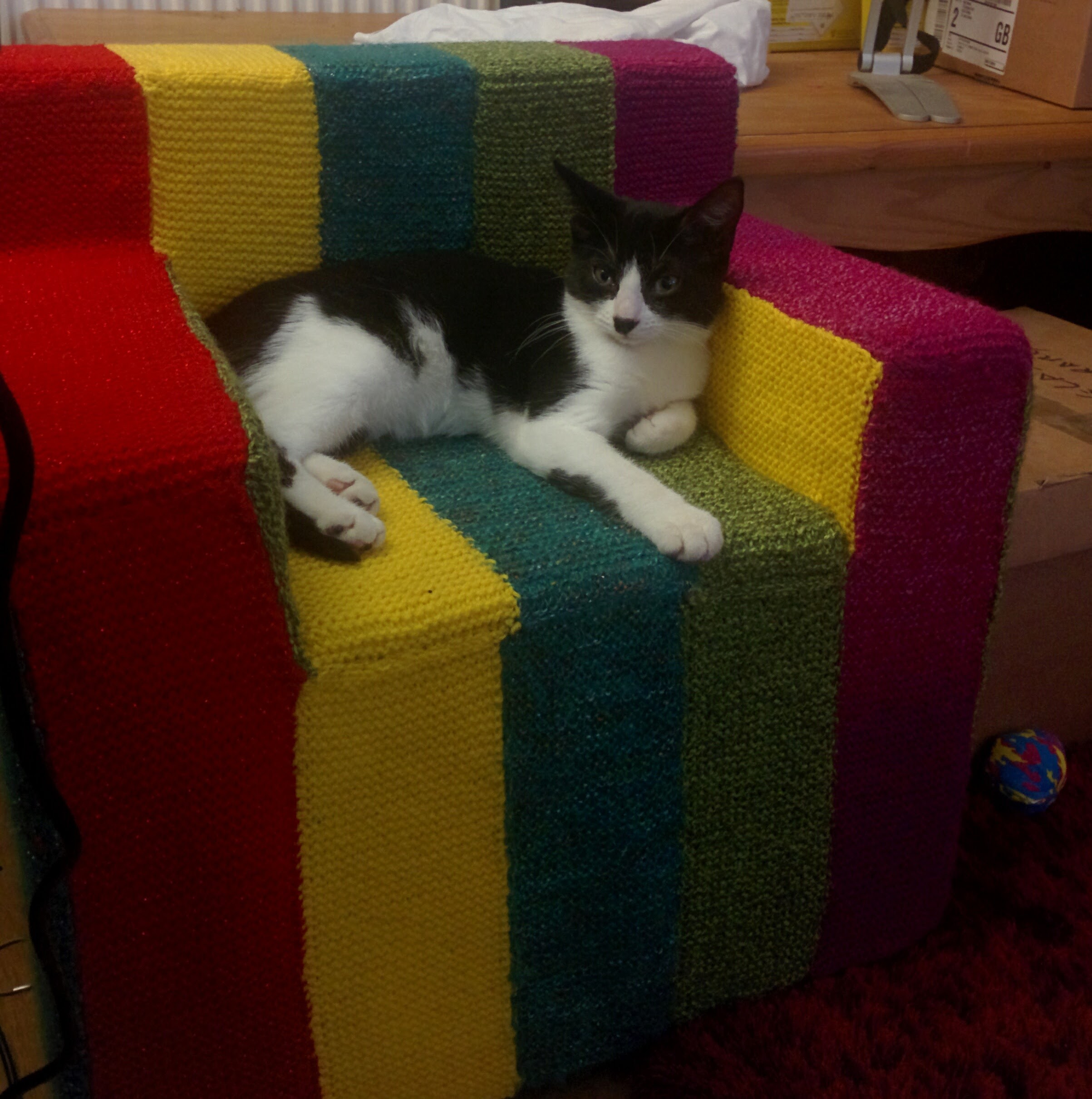 By the time they were due to arrive we had had our best shot at kitten proofing the house, bought a number of toys, a water fountain, a scratching post and a cat tree and tried them all out and my husband had built a castle out of two big cardboard boxes. This got well used through into this summer with a few modifications!