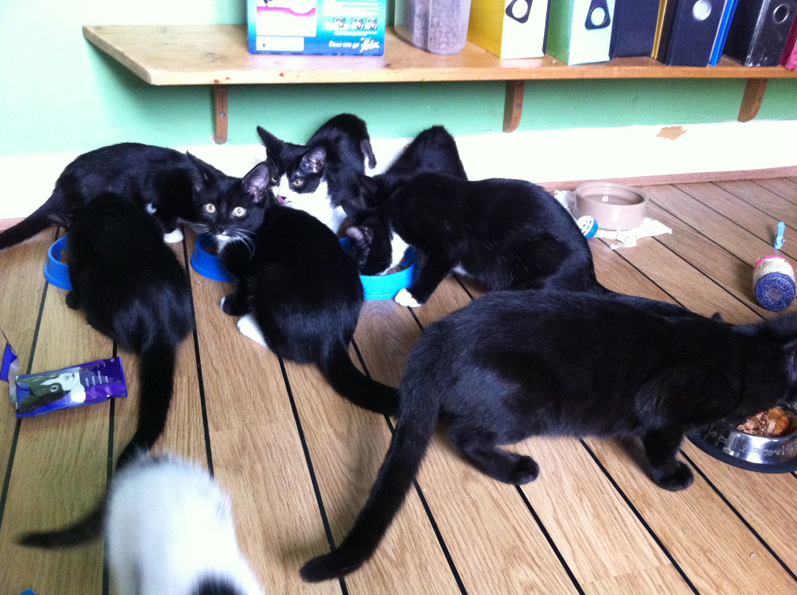 We were introduced to the important art of ‘waving a feather’ which is even more exciting when there are at least six kittens hunting it and the string on the other end of the rod at any one time. Eventually a small black and white lady got tired of the ruckus and hid behind me for a break. Knowing her now I suspect Minnie needed to check we could wave a feather properly before considering coming to live with us. It is her very favourite thing in the world.