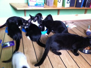 This weekend I’m having a rest from blogging and am delighted to introduce our guest blogger – Simon & Minnie’s mum. For our less avid readers, a little background: Last Spring we took in two heavily pregnant semi feral / farm cats who were closely bonded to each other – Tabbytha & Mowse. They gave birth within a week of each other and brought up their 7 kittens as one big family group. A few weeks later a 5 (ish) week old Simon was found alone in a garden. Long story short, Tabbytha & Mowse adopted him as part of their big family.