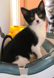 We were given tips on how to tell the different black and white kittens apart, I know the black fur round the noses was often important but I never entirely got the hang of it. However when it came to the two black kittens we were told ‘stroke him, if he purrs its Simon! Simon certainly knew how to make a good first impression carefully pulling his claws playing with my husband and purring his huge purr.