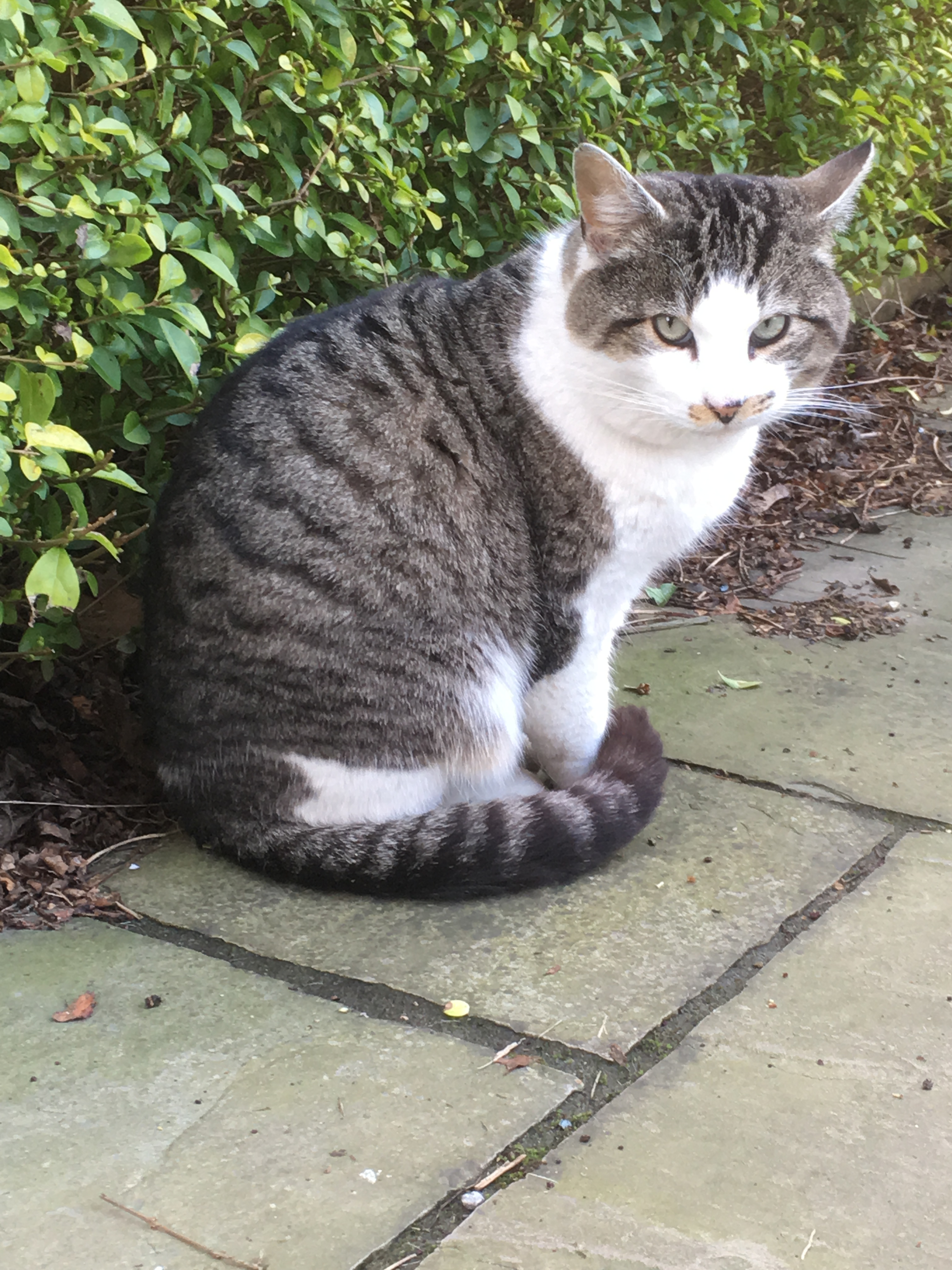 A few weeks later my other neighbours asked me if I’d seen this tabby and white cat and were worried that he was limping. I soon spotted him and tried to engage him in conversation … but he didn’t want to know. It’s taken some time to make friends with him but we’re getting there. I invited him for a meal and he accepted … with the proviso that I sat the other end of the driveway whilst he ate. Then he started letting me closer, and sitting waiting for me at tea time, and then letting me stroke him a little.