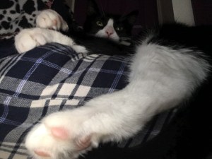 We arrived home one day to find that Stanlie (our regular stray who is waiting a rescue place) had been joined by a very handsome tuxedo cat. We was very friendly and hungry. So I went indoors to get some food and the microchip scanner. No chip and not neutered, but at least he was fed and it was warm and dry outside. We had no space to take anyone in, or Stanlie would have been in. Set to work checking lost and found ads.