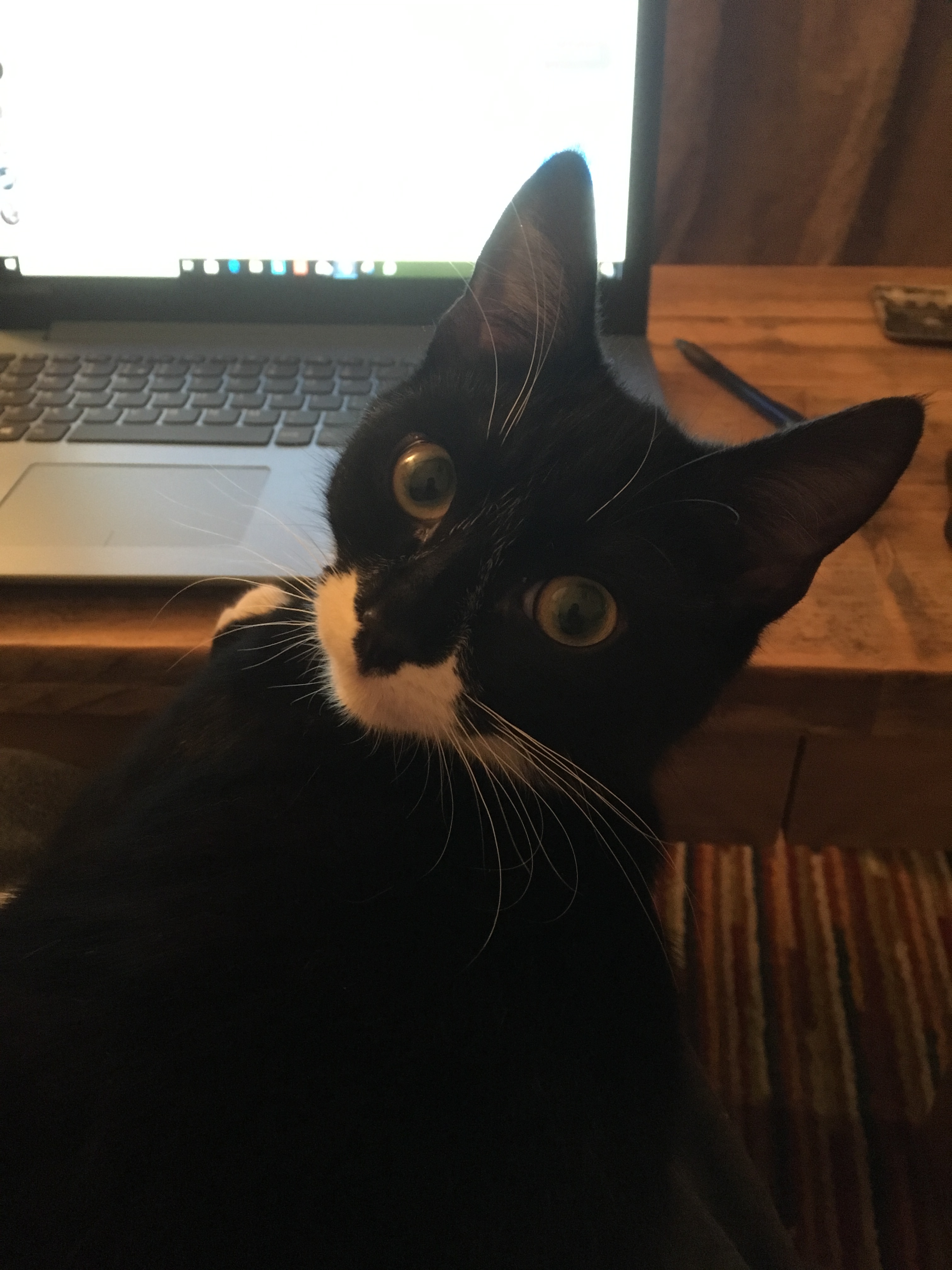 He’s a little bit shy with people until he gets to know them, but clearly enjoys the company of other cats. He loves playing with Rufus and Flipper (though the delight isn’t always mutual)