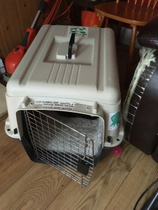 - a very large, very sturdy carrier which was donated to us after someone moved to the UK with a couple of cats. We set this up in the lounge back in June, with a comfy bit of vet bed and regular spinklings of cat nip … so it could come to be seen as a cool place to hang out.