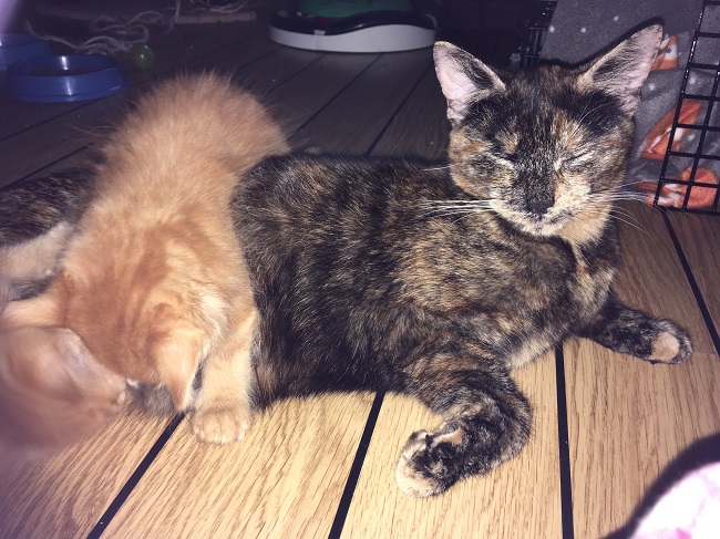 She’s a sweet, friendly little cat though a little shy as a result of the chaotic situaton she lived in previously. We’ve chosen “not sure” in response to whether she’s ok with children. I think she’d most likely be fine with sensible children who are able treat animals with respect. She’s probably not the right cat for kids who are keen to have lots of interaction and paly time with a cat. She’s been used to living in a multi cat household but again we’ve chosen “not sure” rather than a definite “yes” as its difficult to assess when mums are caring for kittens.