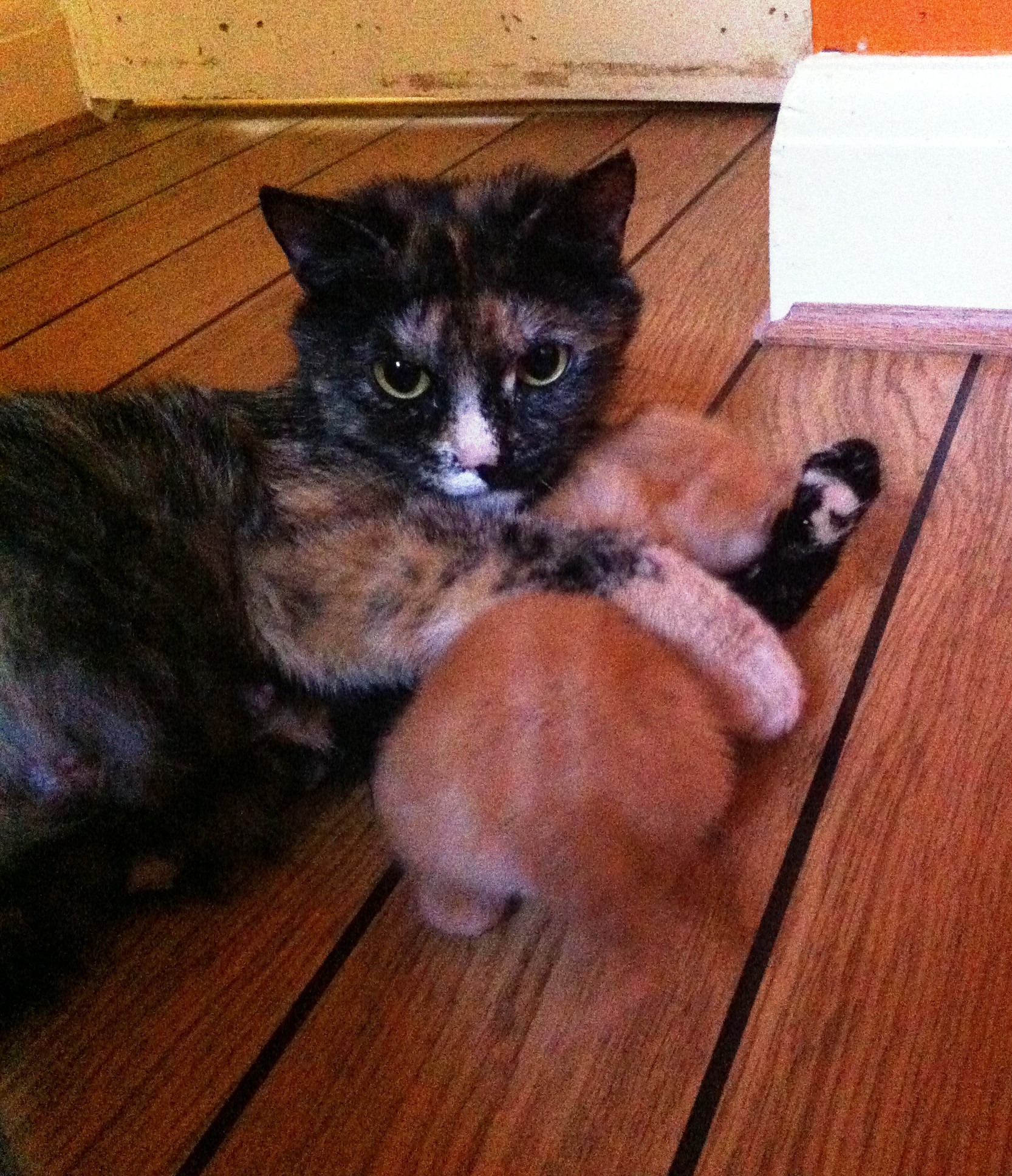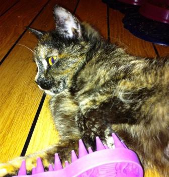 Young Betty was found as a stray in someone’s garden, and fast-tracked her way into rescue because she was very pregnant. She was pretty clearly a first time and rather bemused young mum, but is now well into the process of weaning and litter training her kittens. We’re hoping the kittens will be off to their new homes early to mid August, and then Bettty will be looking for a second chance in life, a chance to enjoy being a young cat with no responsibilities other than to rediscover her inner kitten and learn to play again. She’s a sweet little girl who needs to get her life back on track.