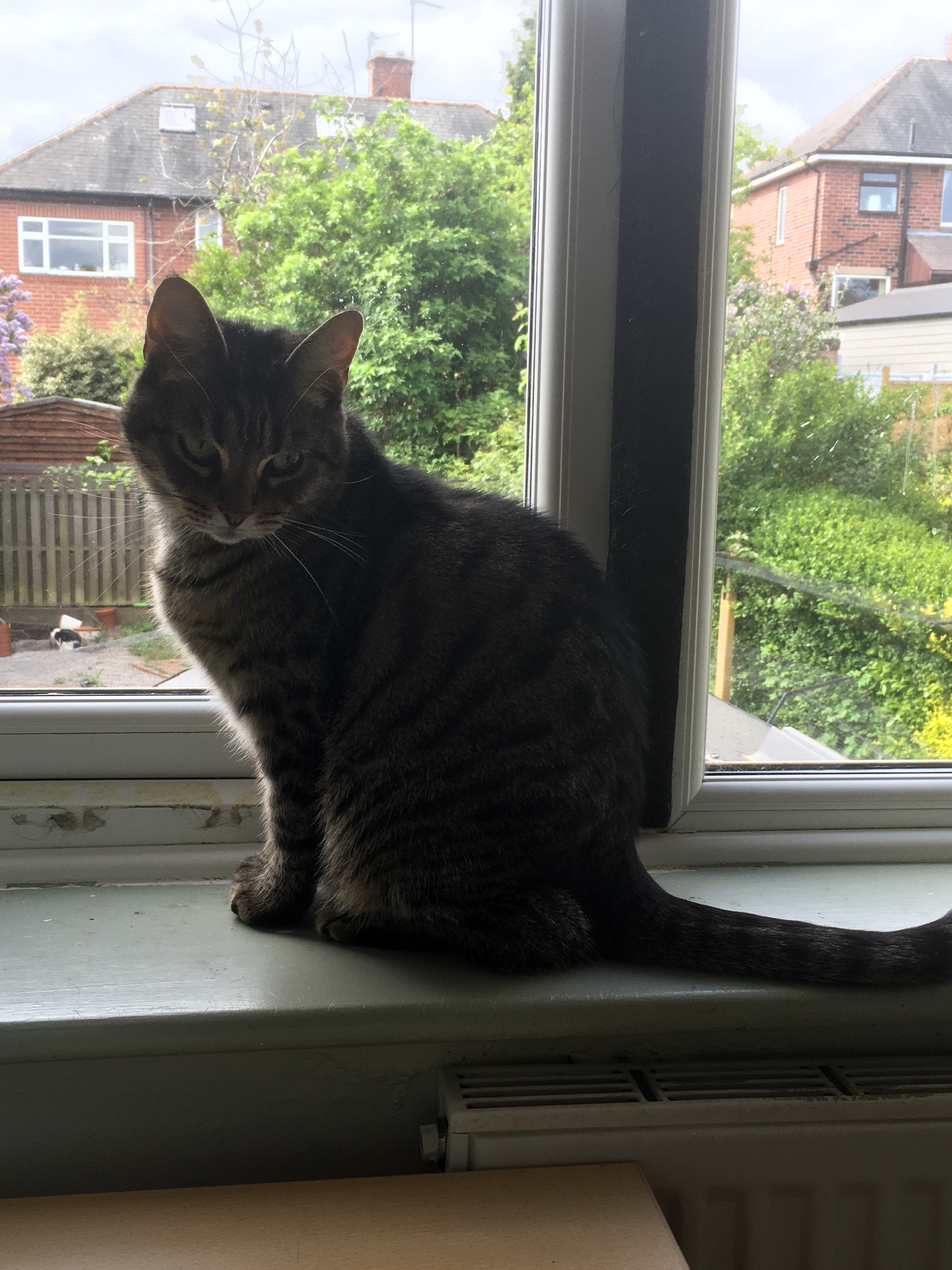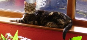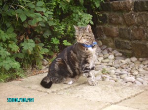 It was a gloomy Sunday lunchtime towards the end of November 2001 when I looked out the window to see a small tabby cat looking back at me.  If I’d known then what I know now, I’d have quickly assessed that she was about 6-8 months old, but back then she was just a small tabby cat.   I knew enough to know that she looked lost though.  I’d moved in with my partner earlier that year and desperately wanted to have a cat, but he didn’t understand what cats were for, so I’d not wanted to push the subject.  However, here was a cat, lost and perhaps waiting to move in, quite a different proposition from suggesting we set out to “get” a cat  … my brain flew through so many thoughts and hopes.   Normally veggie but a rare eater of fish, I didn’t hesitate when the question “what do you fancy for lunch?” came up.   Tuna sandwiches … just had to be.   One thing led to another … strangely there was “just a bit of tuna left” … and it was shame to waste it.   Then one of the neighbourhood cats jumped over the gate and scared her and the next thing I knew I’d pulled her into the kitchen for safety.   She spent most of the rest of the day “safely” curled up on my lap.  It came to bedtime and we had no litter tray and no cat flap … and maybe she belonged to someone anyway, so we put her back outside (gulp …. I hate to think of this now).   I was so disappointed that there was no sign of her during the following day however she turned up at tea time.  I went to the corner shop and bought just one can of cat food .. only one … because of course this was only temporary … just until we found who she belonged to.