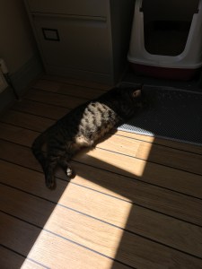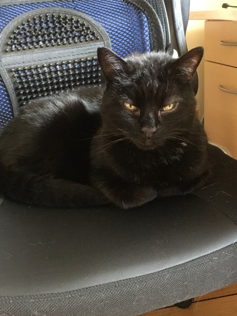 Who knows what the other cats know and understand about this situation?  Moreover, who would believe they give a flying f@ck about any of it even if they do?  Nevertheless on my first morning back I was flanked by Honey and Flipper.   They’d obviously popped into the office before when Jango was in charge, had a look round and a nap and left again.  This time though they stayed all day, and all day the days after too.