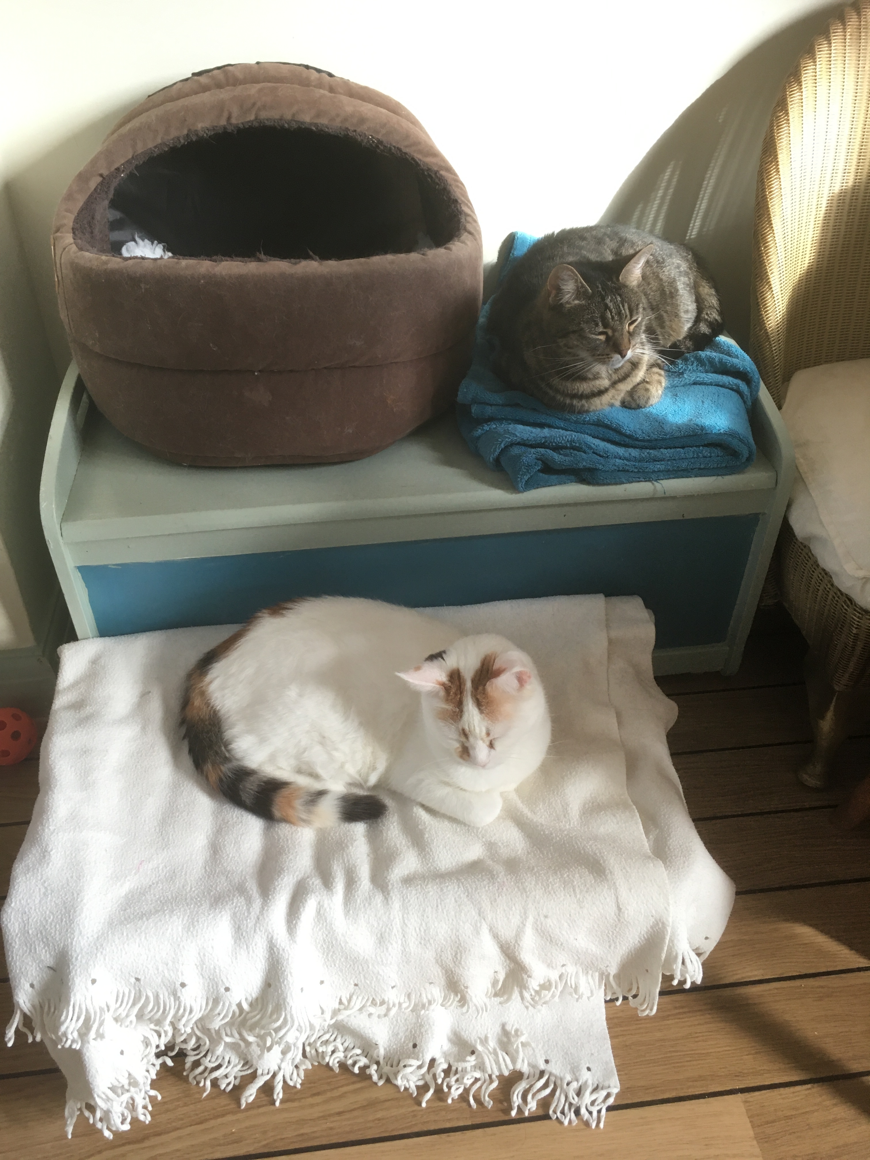The hoomans live in a place without any stairs so it’s easy for me to get about. I have four blankets – the yellow one for looking out of the window, the blue one for sunning myself on my king-size bed in the afternoon, the white one for bedtime and the green one on my day bed. But of course, I go to sleep wherever I want. I am disappointed that my electric blanket seems to be broken since the beginning of July though.