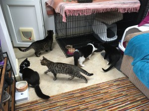 The following day, August bank holiday Monday we planned a rare treat .. going out to a concert that was nothing to do with cats. My friend and I had just settled ourselves into our seats when my phone buzzed. The first cat, the one that had evaporated, had rematerialised. We left the concert, came home and turned the house upside down in order to accommodate an extra cat that we didn’t have space for. Luci who had been starting to mix gradually with the resident cats was evicted from his bedroom and thrown in at the deep end with the gang. I have to say he’s managed this magnificently.