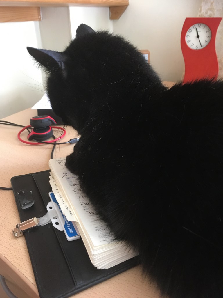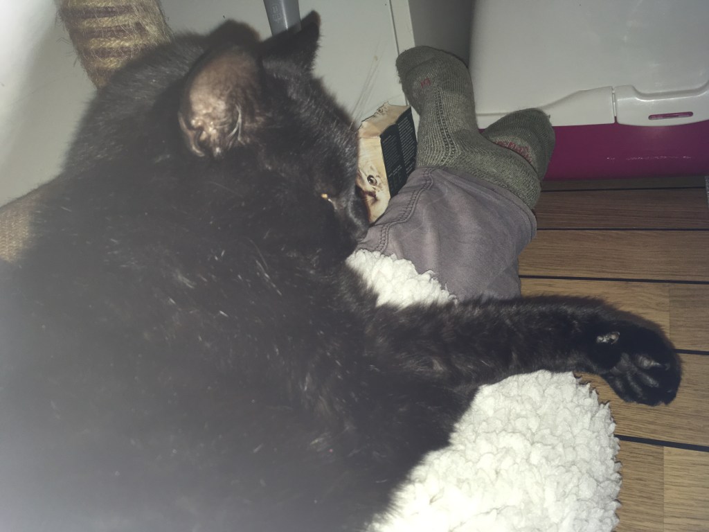 Obviously we then had to get cover in at short notice.  No one felt able to cover a full shift, so it was a bit of a patchwork.  Henderson put in a couple of hours, snuggled on my lap so I couldn’t move to reach anything.
