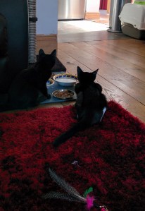 Minnie and Simon arrived snuggled up together in the carrier having spent the journey looking around. Minnie began her explorations by climbing the scratching post and batting the cat nip ball my husband had balanced off the top. She also had some fun chasing feather although we soon used our voucher to get her favourite kind of feather and rod. Simon also had a look round and a sit on the lap of the person who looked after him when he was tiny and then tried getting back in the carrier. When it was explained that he couldn’t come back further exploration prooved that he could hide in the sofa. For several weeks after when people asked how the cats were I’d reply that the sofa was purring.
