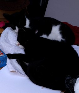 We were given tips on how to tell the different black and white kittens apart, I know the black fur round the noses was often important but I never entirely got the hang of it. However when it came to the two black kittens we were told ‘stroke him, if he purrs its Simon! Simon certainly knew how to make a good first impression carefully pulling his claws playing with my husband and purring his huge purr.