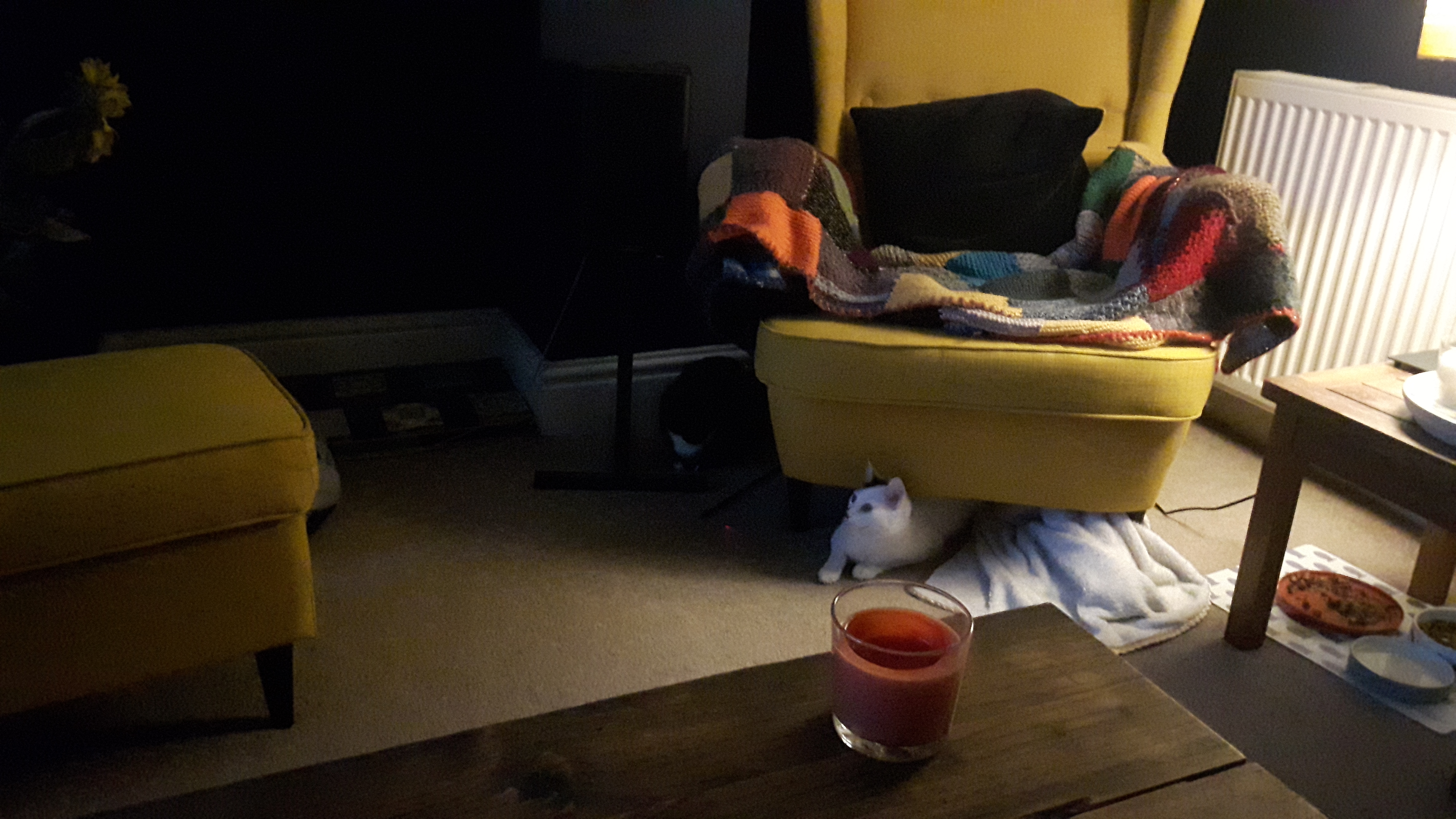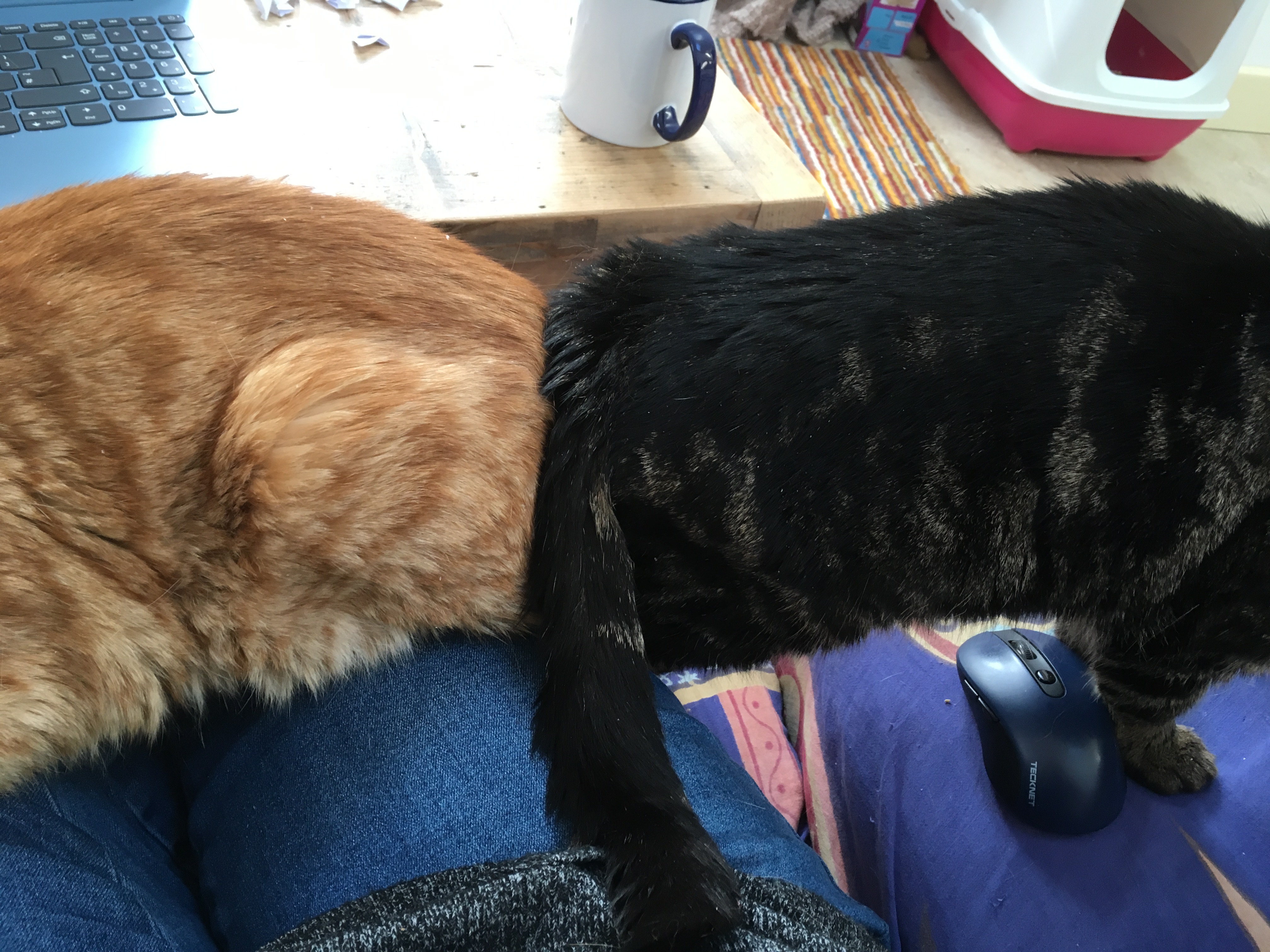 Jette hid at first, but over a few days made friends thanks to some chicken. She quickly became very friendly and affectionate. We created a nice little cot with the “really useful box” that has served for all births here since Betty’s kittens. Jette refused to look at it. She alternated between her bed on a chest of drawers and perching on an almost ceiling height shelf. I anxiously watched her on the webcam from work, though I’m not sure how I was going to help from miles away, or what I thought I’d tell my manager as I rushed out the building.