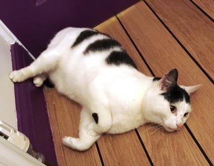 We know that all cats are unique. Mikey was unique in a rather special way though that reminded us of a dog. When he arrived he had his tail tucked firmly between his legs to the extent that we were concerned (it turned out unnecessarily) that he was injured. In his anxiety he huddled close to Beverley and kept his distance from me. He soon realised he was fine, his tail relaxed and he started enjoying cuddles with me. A few weeks later when his furever family came to meet him for the first time, he tucked his tail in and huddled next to me whilst he weighed up his potential new staff. That makes a lot of sense on one level .. but its mostly not what cats do! I’ve known plenty of dogs who snuggle close when scared but mostly however much cats are loved, when they’re scared most cats hide or push us away. Remember the last time you tried to help Tibbles down from the shed roof, or unhook Fluffy when her claws were stuck in something? When I took him to his new home it was the same – he tucked his tail in and huddled next to his new mum, then shyly went to the outstretched hands of his other new family members. Then as his confidence grew he escorted his new dad to the kitchen to check out what was in the fridge ….. and then took him back to get seconds! There were tears in my eyes as I watched this last stage in his transformation from an abandoned piece of rubbish to king of his little castle with doting servants.