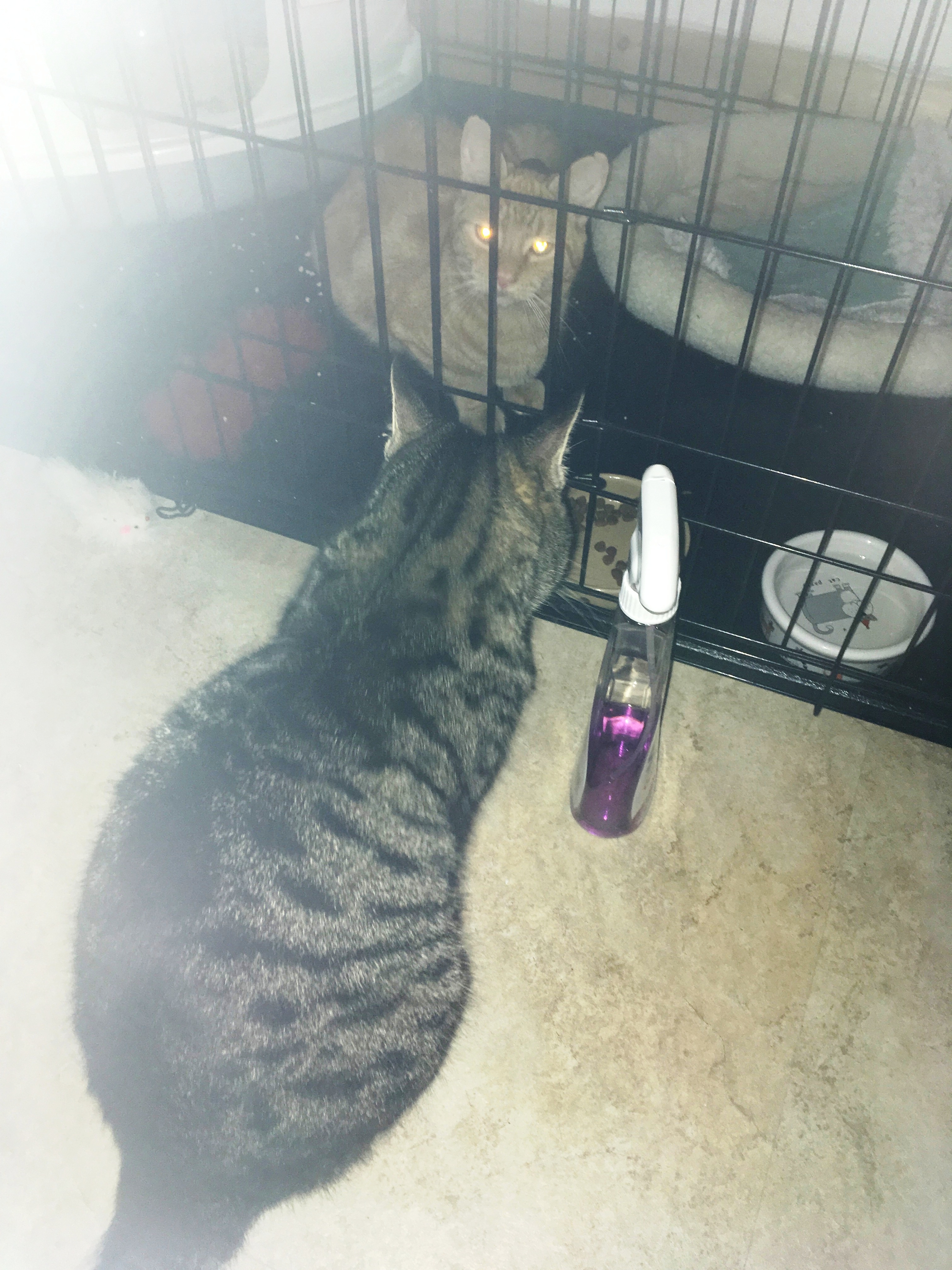 The day Simon and Minnie were coming was also the day when I could do a pregnancy test. We got up early planning to get it done so we’d know I wasn’t pregnant this month and could put it aside and focus on the cats. Sure enough there I was staring at a test strip going ‘er that isn’t actually negative…’ It was an exciting day all round!