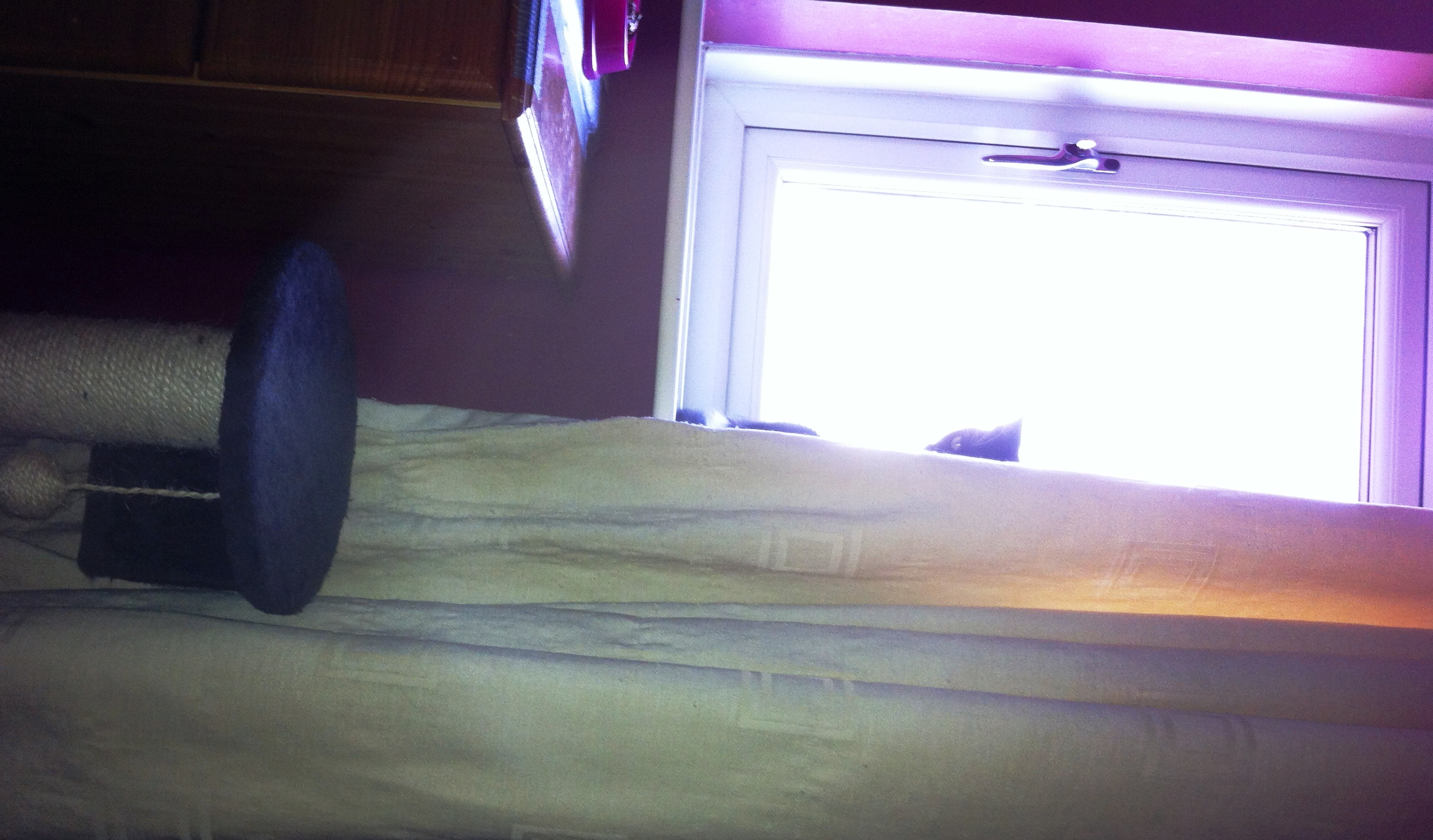We’re all happy now. Echo is under the bed still but purring lots and enjoying a fuss. Edna has made her way down from the heights.
