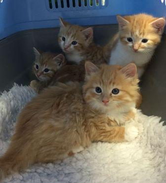 The mum of this little group of kittens came into rescue about a fortnight before they were born, having lived rough through most of her pregnancy. They were born on 3 September and mum cared for them beautifully until they were about 6 weeks old, at which point the stress of being in rescue and cooped up with her kittens got too much for her and she started to be aggressive towards them to the extent that we had to take the decision to separate them. Ideally they would have had mum with them for much longer, but the positive side of it is that the kittens have lived in the main part of the house alongside our resident cats, and had more socialisation time with humans and other cats that they would have had mum been still with them.