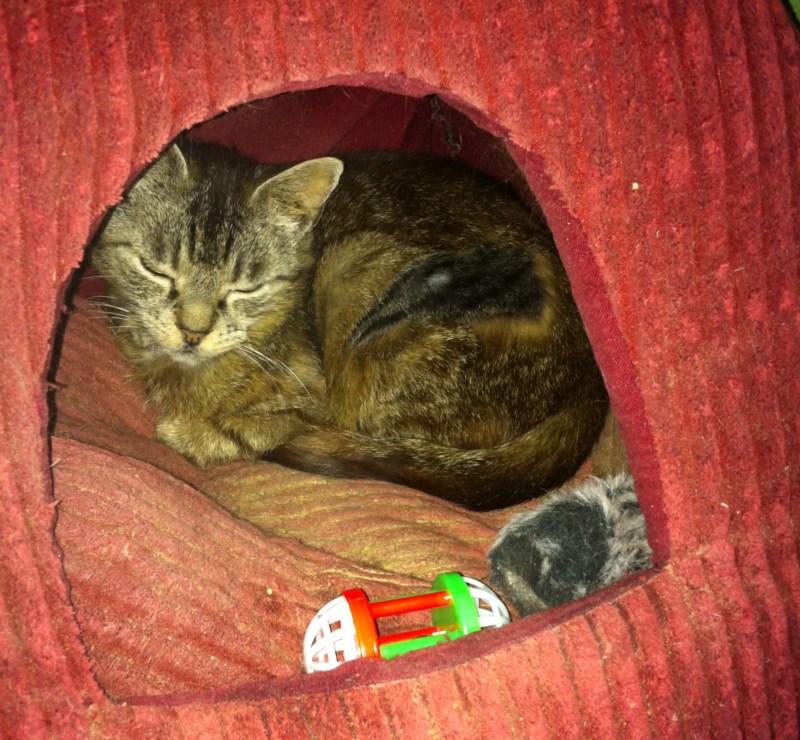 May with her stash of toys