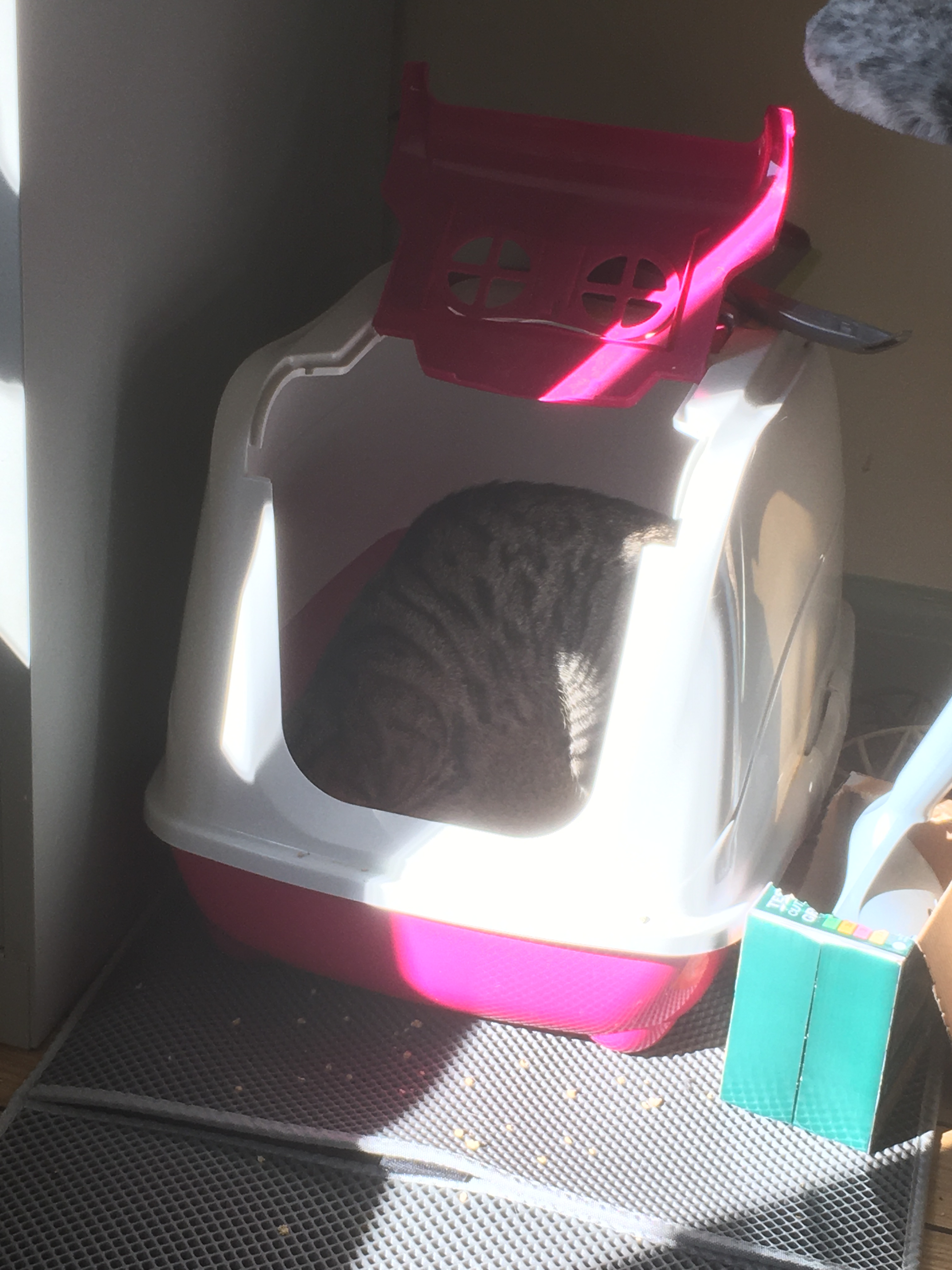 The hoomans live in a place without any stairs so it’s easy for me to get about. I have four blankets – the yellow one for looking out of the window, the blue one for sunning myself on my king-size bed in the afternoon, the white one for bedtime and the green one on my day bed. But of course, I go to sleep wherever I want. I am disappointed that my electric blanket seems to be broken since the beginning of July though.