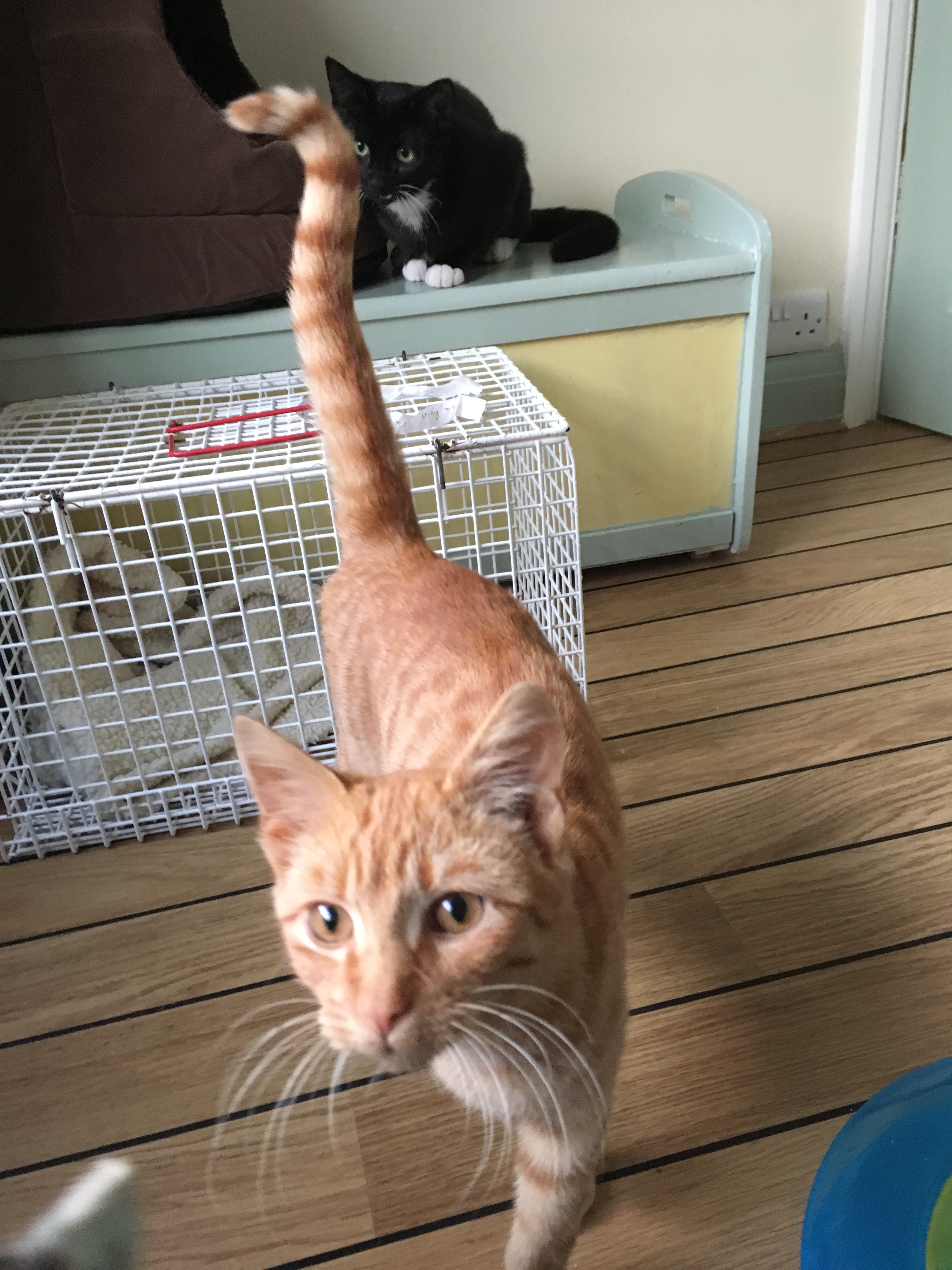 They’re both loving gentle little boys about 5-6 months old and very purry. Relish was kind and gentle with the 6 year old boy who was part of the main family caring for him. He’s been friendly though a little shy with the cats he’s met here. Raffles arrived a few days after Relish and was more shy initially but as he’s started to relax his fun loving purrsonality has started to shine though. They’ve both needed a little help and encouragement to start playing again … the weight of the world was probably on their little shoulders whilst living rough.